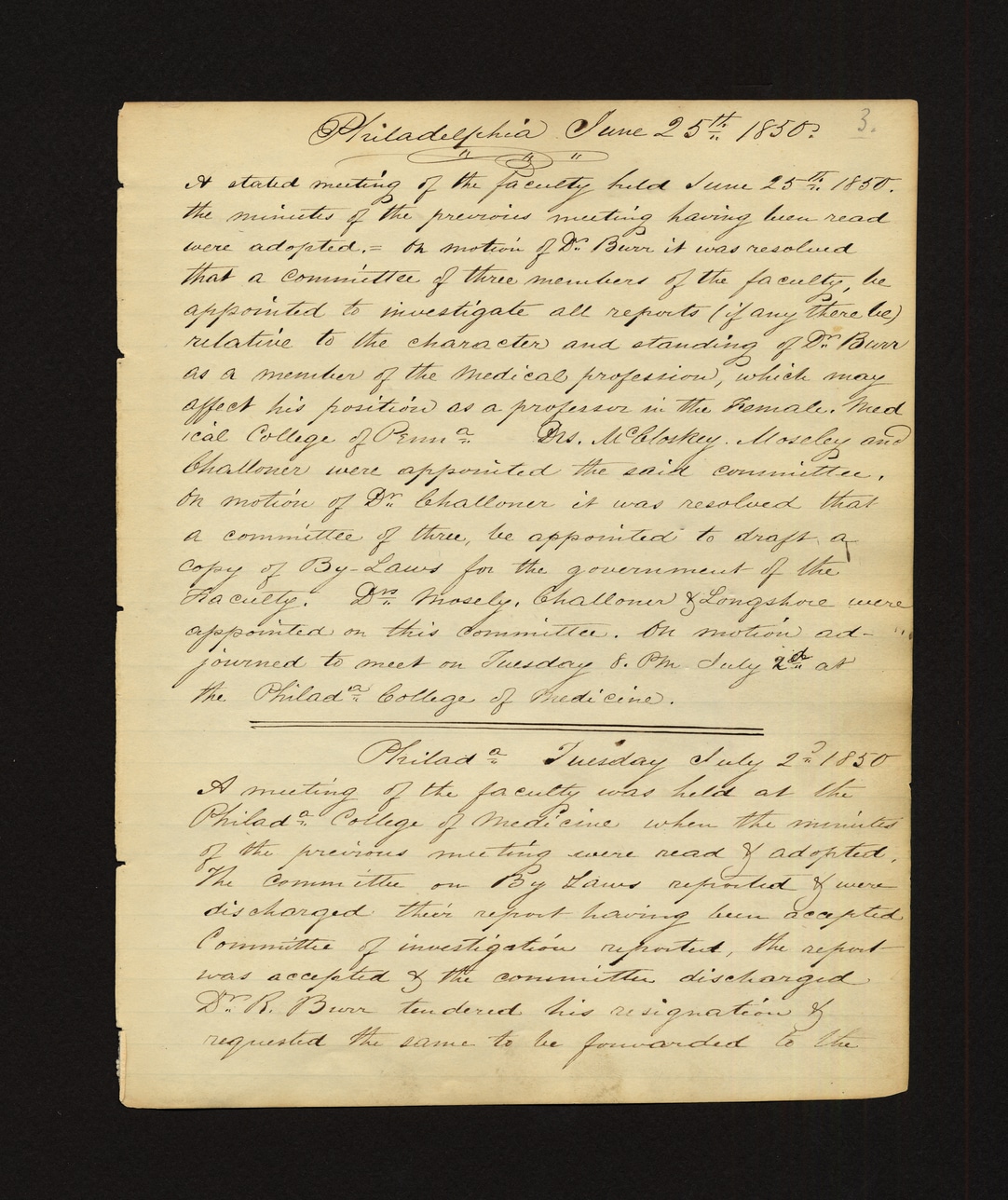 Philadelphia June 25th, 1850 A stated meeting of the faculty held June 25th, 1850. The minutes of the previous meeting having been read were adopted. On motion of Dr. Burr it was resolved that a committee of three members of the faculty be appointed to investigate all reports (if any there be) relative to the character and standing of Dr. Burr as a member of the Medical profession, which may affect his position as a professor in the Female Medical College of Penna. Drs. McCloskey, Mosely and Challoner were appointed the said committee. On motion of Dr. Challoner it was resolved that a committee of three be appointed to draft a copy of By-Laws for the government of the Faculty. Drs. Mosely, Challoner & Longshore were appointed on this Committee. On motion adjourned to meet on Tuesday 8 P.M July 2nd at the Philad. College of Medicine. Philadelphia Tuesday July 2nd, 1850 A meeting of the faculty was held at the Philad. College of Medicine when the minutes of the previous meeting were read & adopted. The committee on By Laws reported & were discharged their report having been accepted. Committee of investigation reported, the report was accepted & the committee discharged. Dr. R. Burr tendered his resignation & requested the same to be forwarded to the
