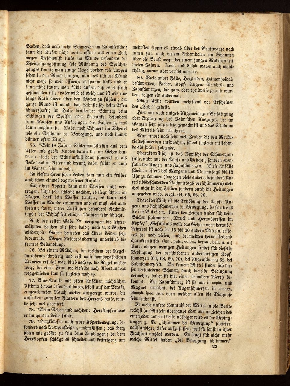 Backen, doch noch mehr Schmerzen im Zahnfleische; kann die Kiefer nicht weiter öffnen als einen Zoll, wegen Geschwulst links im Munde besonders der Speichelgangöffnung (die Mündung des Speichelganges konnte man einige Tage vorher wie Lappen sehen in den Mund hängen, nun liß sich der Mund nicht mehr so weit öffnen); es spannt links und er kann nicht kauen, man fühlt außen, daß es elastisch geschwollen ist; später wird es weich und ist wie eine lange Nase quer über den Backen zu fühlen; der ganze Mund ist wund, das Zahnfleisch beim Essen schmerzhaft; im Halse drückender Schmerz beim Schlucken der Speisen oder Getränke, besonders beim Rachen und Aufbringen des Schleims, was kaum möglich ist. Dabei noch Schmerz im Scheitel wie ein Geschwür bei Bewegung, und noch immer dünner oftener Stuhl. 75. *Seit 18 Jahren Schleimauflösse aus dem After und große Knoten daran die im Gehen hindern; stößt der Schleimfluß dann schmerzt es als stecke was im After und brennt, dabei fühlt er auch im Ganzen sehr unwohl. Zu diesem chronischen Leiden kam nun ein früher auch schon einmal dagegenwesener Anfall: Schlechter Appetit, kann viele Speisen nicht vertragen, fühlt sich schlecht nachher, es liegt schwer im Magen, darf kein Wasser trinken; es läuft viel Wasser im Munde zusammen und er muß viel ausspülen; sauer, bitter Aufstoßes besonders Nachmittags; der Schlaf seit etlichen Nächten sehr schlecht. Nach der ersten Gabe Xo vergingen die leichten- wahren Zeichen alle sehr bald; nach 2, 3 Wochen wiederholte Gaben befesten das ältere Leiden sehr bedeutend. Wegen Ortsveränderung unterblieb die fernere Behandlung. 76. Bei einem Mädchen, bei welchem der Regel- durchbruch schwierig und erst nach homöopathischen Arzneien erfolgt war, blieb nach sp. die Regel wieder weg; bei einer Frau wo dieselbe nach Abortus war weggelassen kam sie sogleich nach sp. 77. Eine-Kranke mit often Anfällen nächtlichen Asthma's, was besonders durch, selbst auf der Straße, eingetauchtem Rauch wieder aufgeregt wurde, die außerdem zuweilen Flattern des Herzens hatte, wurde sehr viel gehebelt. 78. *Beim Gehen und nachher: Herzklapfen was er im ganzen Leibe fühlt. 79. *Herzklapfen nach jeder Körperbewegung, besonders nach Treppensteigen, nachm Essen; das Herz schien mit großer zu sein beim Anschlagen; bei dem Herzklapfen schlägt es schneller und kräftiger; am mehrsten klopft es etwas über der Brustwarze nach innen zu; nach vielem Atmenholen ein Spannen über die Brust weg—bei einem jungen Mädchen seit vielen Jahren. Lach. und Sulph. waren auch wohlthätig, aurum aber verschlimmerte. 80. Biele andre Fälle, Herzleiden, Hämorrhoidal-beschwerden, Fieber, Kopfs- Augen- Gesichts- und Zahnschmerzen, die ganz oder theilweise geheilt wurden, folgen ein andermal. Obige Fälle wurden meistens vor Erscheinen des „Jahr" geheilt. Hier nur noch einiges Allgemeine zur Bestätigung oder Ergänzung des Jahr'schen Auszuges, der im Ganzen sehr sorgfältig gemacht ist und das Studium des Mittels sehr erleichtert. Man findet noch sehr viele Zeichen die den Merku- rialbeschwerden entsprechen, sowol sogleich entstehen- de als später folgende. Charakteristisch ist das Typische der Schmerzan- fälle, nicht nur der Kopf- und Gesicht-, sondern eben- falls der Augen- und Zahnschmerzen. Diese Anfälle scheinen öfters des Morgens und Vormittags bis 12 Uhr zu kommen (dagegen viele andere, besonders Unterleibsbeschwerden Nachmittags verschlimmern) wel- ches nicht in den Zeichen sondern durch die Heilungen angegeben wird, vergl. 64, 65, 68, 70. Charakteristisch ist die Erhöhung der Kopf-, Au- gen- und Zahnschmerzen bei Bewegung, besonders bei im Bücken. Unter den Zeichen findet sich beim Buben schlimmer: „Druck und Herauspressen im Kopfe," „Gefühl als wolle das Gehirn vorn heraus." Letzteres ist noch bei 15 bis 20 andern Mitteln, erstes bei noch vielen, und bei mehreren hervorstechend charakteristisch (ign., puls., coloc., bryon., bell. u. a.) Unter obigen wenigen Heilungen findet sich dieselbe Bedingung bei verschiedenen andersartigen Kopf- schmerzen (64, 68, 69, 70), bei Augenschmerz 65, bei Zahnschmerz 73. Bei keinem Mittel findet sich die- ser verschiedene Schmerz durch dieselbe Bedingung vermehrt, daher sie hier einen besonderen Werth be- kommt. Bei Zahnschmerz ist sie nur an sepia. und Magnet erwähnt, bei Augenschmerzen in senega, phosph. ipoc. dros. vorn welchen allen die Diagnose sehr leicht ist. Je mehr unsere Kenntnis der Mittel in die Breite wächst (an Mitteln überhaupt oder nur an Zeichen des einen oder andern) desto nötiger wird es die Beding- ungen z. B. „schlimmer bei Bewegung" schärfer, vollständiger, tiefer aufzufassen, weil sie sonst in ihrer Flachheit nutzlos werden. Es fragt sich nicht mehr welche Mittel haben „bei Bewegung schlimmer,"