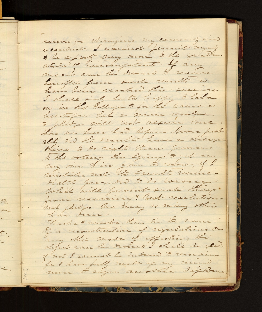 @letter_faculty_actions:document -> expresses -> {concern: "faculty may immutably proceed to do wrong", desire: "prevent recurrence of wrongdoing", request: "reconstruction of regulations or other effective measures"}reason in changing my course of view or conduct. I cannot permit myself to be a party any more to the grade action or incapacitate. If any means can be devised to secure herself from such results as have been reached this session, I shall only be too happy & labor on in St. College & for the Cause as heretofore—but a mere resolve & pledge will not assure me: thus we have had before—several probably did so & really have a stronger desire to do right than previous to the voting this Spring & yet—in my view & in yours too, now, if I mistake not—the faculty immutably proceed to do wrong—what will prevent such things from recurring? Not resolutions—not pledges. One may as many others have done—"resolve & unresolve—time is the same"—If a reconstruction of regulations or any other mode of effecting the object can be devised I shall be glad, if not—I cannot be induced to remain for I have full made up my mind never to sign an invalid diploma.