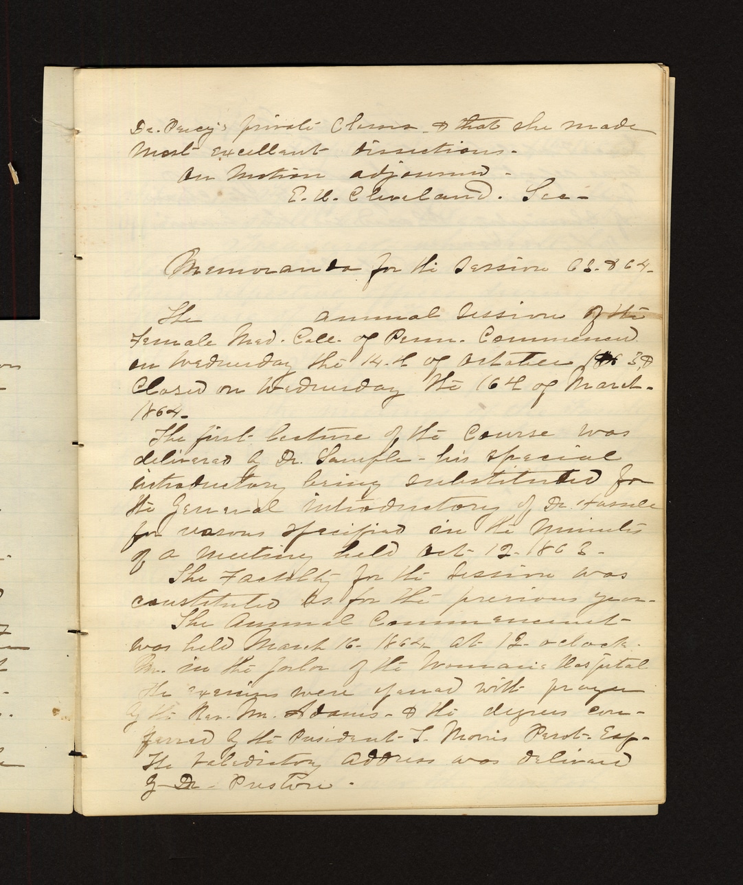 @annual_commencement_1864:event -> included -> @dr_lucy:person {note: "Mentioned in memorandum as having private illness and excellent recoveries"} Dr. Lucy's private illness & that she made most excellent recoveries. An motion adjourned. E.U. Cleveland Sec. Memoranda for the Session 1863 & 64. The annual session of the Female Med. Coll. of Penn. commenced on Wednesday the 14th of October 1863, closed on Wednesday the 16th of March 1864. The first lecture of the course was delivered by Dr. Sample—his special introductory being substituted for the general introductory of Dr. Hance for reasons specified in the minutes of a meeting held Oct 12, 1863. The faculty for the session was constituted as for the previous year. The annual commencement was held March 16, 1864 at 12 o'clock PM in the parlor of the Woman's Hospital. The evening was opened with prayer by the Rev. Mr. Adams & the degrees conferred by the President T. Morris Prentice Esq. The valedictory address was delivered by Dr. Preston.