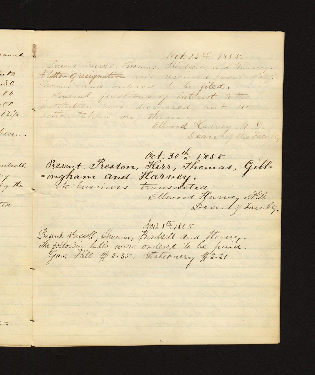 Oct. 23rd, 1855. Present: Fussell, Thomas, Birdsell, and Harvey. A letter of resignation was received from Prof. Thomas and ordered to be filed. Several questions of interest to the institution were discussed, but no action taken on them. Ellwood Harvey M.D. Dean of the Faculty Oct. 30th, 1855. Present: Preston, Kerr, Thomas, Gillingsham and Harvey. No business transacted. Ellwood Harvey M.D. Dean of Faculty Nov. 8th, 1855. Present: Fussell, Thomas, Birdsell and Harvey. The following bills were ordered to be paid: Gas Bill #2.35 Stationery #2.21