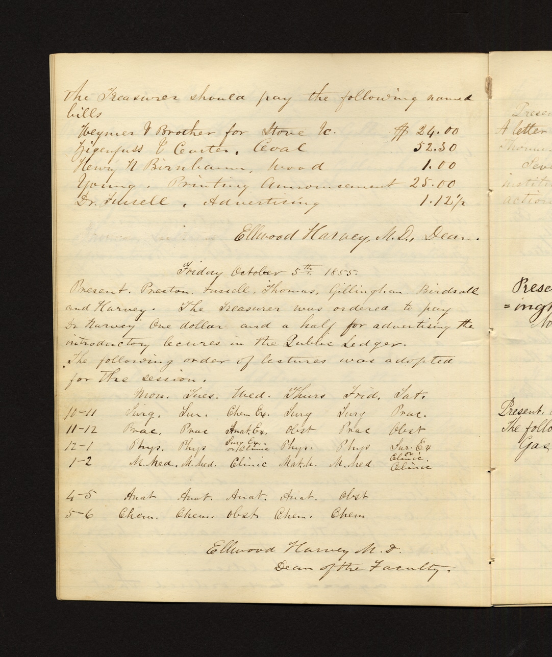 The Treasurer should pay the following named bills: Weymer & Brother for Stone Co. $24.00 Zigenfuss & Carter, Coal 52.30 Henry N. Bimhann, Wood 1.00 Young, Printing Announcement 25.00 Dr. Russell, Advertising 1.12½ Ellwood Harvey, M.D., Dean. Friday October 5th, 1855. Present: Preston, Russell, Thomas, Gillingham, Birdwell and Harvey. The Treasurer was ordered to pay Dr. Harvey one dollar and a half for advertising the introductory lectures in the Public Ledger. The following order of lectures was adopted for the session. Mon. Tues. Wed. Thurs. Fri. Sat. 10-11 Surg. Surg. Chem. Ex. Surg. Surg. Brac. 11-12 Brac. Brac. Anat. Ex. Obst. Brac. Obst. 12-1 Phys. Phys. Surg. Ex. Phys. Phys. Surg. Ex. 1-2 M. Med. M. Med. Clinic Matk. M. Med. Clinic 4-5 Anat. Anat. Anat. Anat. Obst. 5-6 Chem. Chem. Obst. Chem. Chem. Ellwood Harvey M.D. Dean of the Faculty.