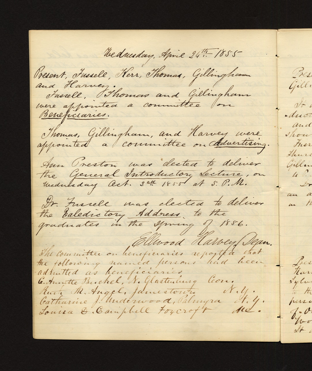 @united_states:place {} # placeholder for country entity (common knowledge)Wednesday, April 24th, 1855 Present, Fussell, Kerr, Thomas, Gillingham and Harvey. Fussell, Thomas and Gillingham were appointed a committee on Beneficiaries. Thomas, Gillingham, and Harvey were appointed a committee on Advertising. Ann Preston was elected to deliver the General Introductory Lecture, on Wednesday Oct. 3rd 1855 at 5 P.M. Dr. Fussell was elected to deliver the Baledictory Address to the graduates in the Spring of 1856. Ellwood Harvey, Dean. The committee on beneficiaries reported that the following named persons had been admitted as beneficiaries: C. Annette Buckel, N. Glastenbury Conn. Ruth M. Angel, Jamestown N.Y. Catharine J. Underwood, Palmyra N.Y. Louisa D. Campbell Toyicroft Md.