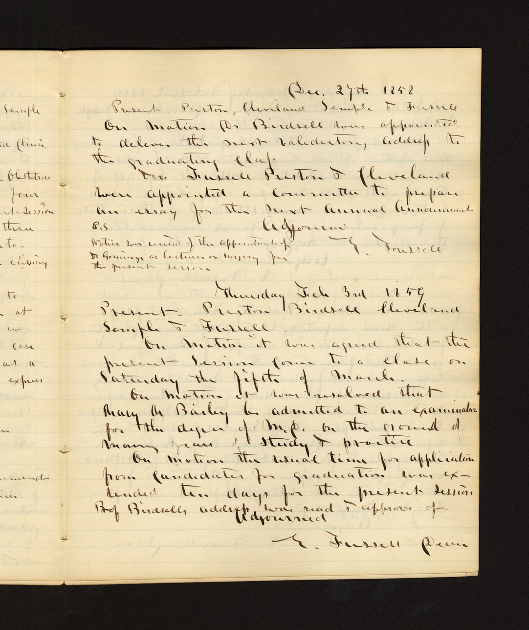 Dec. 27th, 1858 Present: Preston, Cleveland, Sample & Furrell On motion, Dr. Birdsell was appointed to deliver the next valedictory address to the graduating class. Dr. Furrell, Preston & Cleveland were appointed a committee to prepare an essay for the next annual announcement. P.S. Notice was given of the appointment of Dr. Gormings as lecturer on surgery for the present session. G. Furrell Thursday Feb. 3rd, 1859 Present: Preston, Birdsell, Cleveland, Sample & Furrell On motion it was agreed that the present session come to a close on Saturday the fifteenth of March. On motion it was resolved that Mary M. Bailey be admitted to an examination for the degree of M.D., on the ground of many years of study & practice. On motion the usual time for application from candidates for graduation was extended ten days for the present session. Prof. Birdsell's address was read & approved of. Adjourned G. Furrell, Pres.