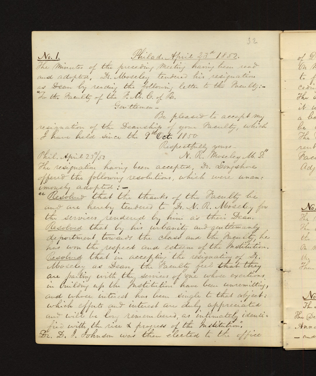 @faculty_of_fmc -> adopted -> [@resolution_1, @resolution_2, @resolution_3] {unanimously: true}No. 1. Philad. April 23rd 1852. The Minutes of the preceding Meeting having been read and adopted, Dr. Moseley tendered his resignation as Dean by reading the following letter to the Faculty:— "To the Faculty of the F.M.C. of Pa. Gentlemen— Be pleased to accept my resignation of the Deanship of your Faculty, which I have held since the 9th Oct. 1850 Respectfully yours, N. R. Moseley M.D." Phil. April 23/52 The resignation having been accepted, Dr. Longshore offered the following resolutions, which were unanimously adopted:— "Resolved that the thanks of the Faculty be and are hereby tendered to Dr. N. R. Moseley for the services rendered by him as their Dean. Resolved that by his urbanity and gentlemanly deportment towards the class and the Faculty, he has won the respect and esteem of the Institution. Resolved that in accepting the resignation of Dr. Moseley as Dean, the Faculty feel that they are parting with the services of one whose exertions in building up the Institution have been unremitting, and whose interest has been single to that object: which efforts and interest are duly appreciated and will be long remembered, as intimately identified with the rise & progress of the Institution." Dr. D. I. Johnson was then elected to the office