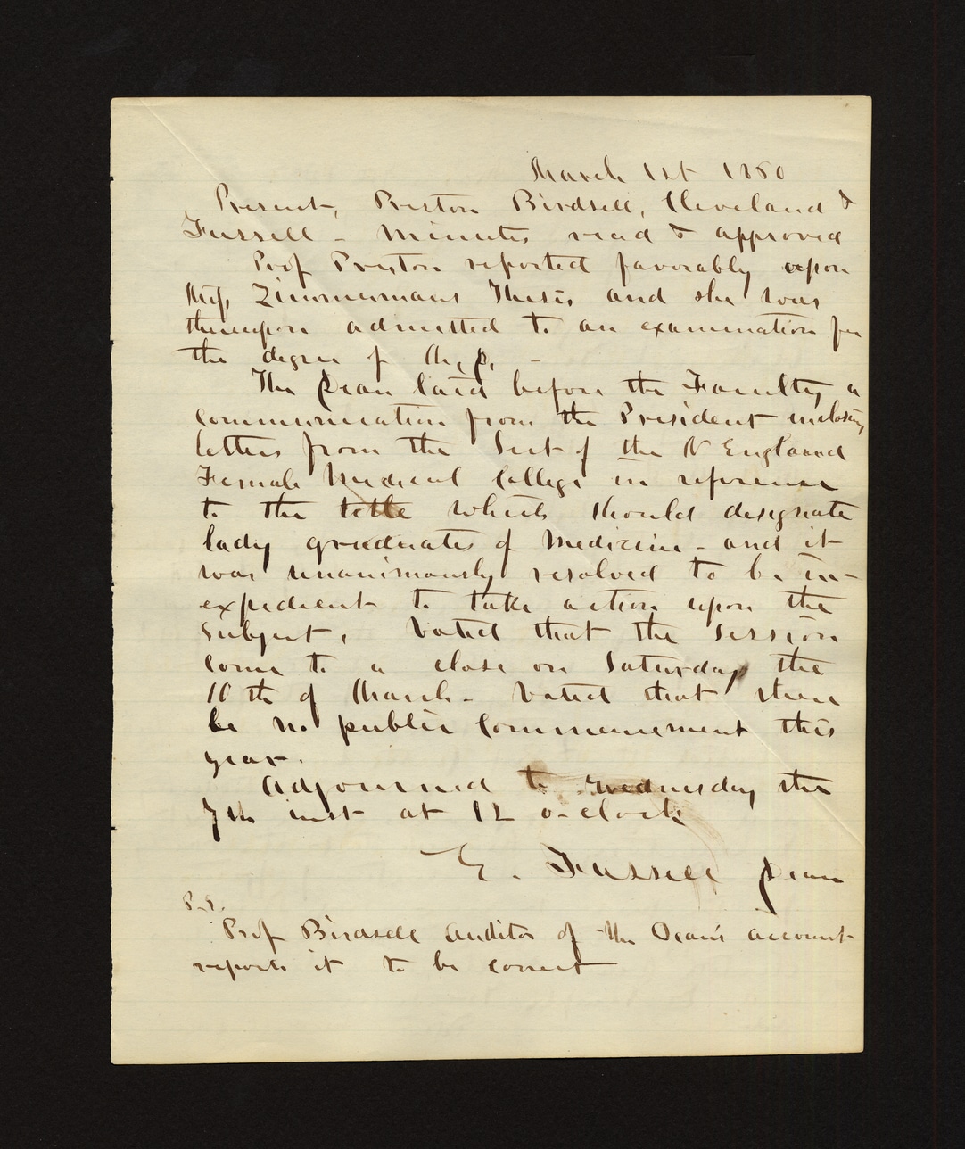 @adjournment:concept {description: "adjournment to next meeting", when: @date_1850_03_07, time: "12:00"}March 1st, 1850 President, Boston, Birdsell, Cleveland & Furrell - Minutes read & approved. Prof. Boston reported favorably upon Miss Zimmerman's thesis, and she was therefore admitted to an examination for the degree of M.D. The plan laid before the Faculty a communication from the President—inclosing letters from the best of the N. England Female Medical College in reference to the title which should designate lady graduate of Medicine—and it was unanimously resolved to be inexpedient to take action upon the subject. Voted that the session come to a close on Saturday the 10th of March. Voted that there be no public commencement this year. Adjourned to Wednesday the 7th inst at 12 o'clock. E. Furrell pres. P.S. Prof. Birdsell Auditor of the Ocean accounts reports it to be correct.