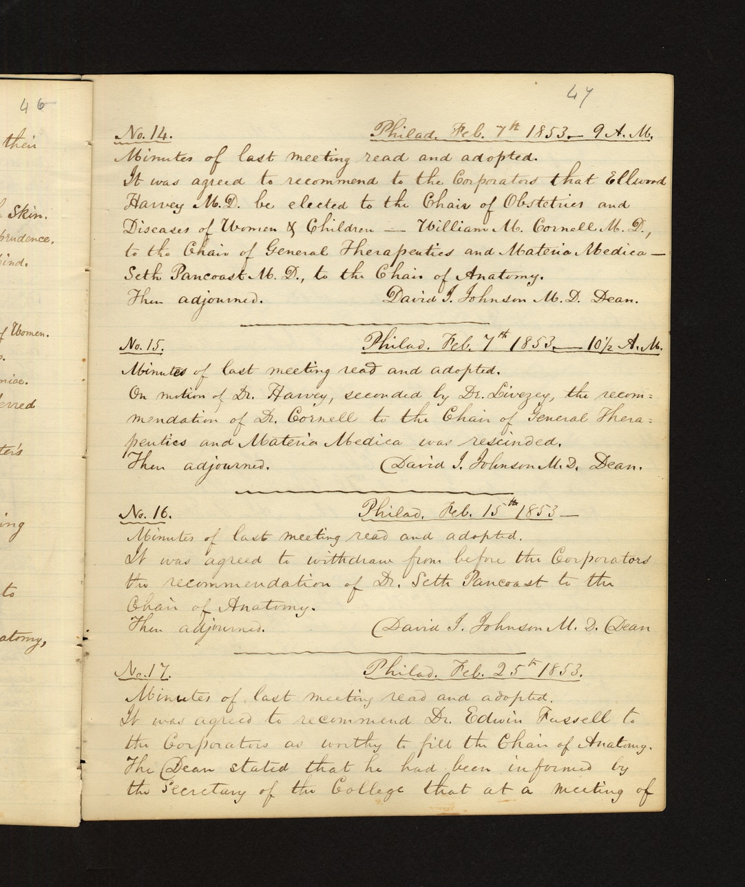 @meeting_feb_25_1853:event -> adjourned by -> @david_i_johnsonNo. 14. Philad. Feb. 7th 1853—9 A.M. Minutes of last meeting read and adopted. It was agreed to recommend to the Corporators that Ellwood Harvey M.D. be elected to the Chair of Obstetrics and Diseases of Women & Children — William M. Cornell M.D., to the Chair of General Therapeutics and Materia Medica — Seth Pancoast M.D., to the Chair of Anatomy. Then adjourned. David I. Johnson M.D. Dean. No. 15. Philad. Feb. 7th 1853—10½ A.M. Minutes of last meeting read and adopted. On motion of Dr. Harvey, seconded by Dr. Livezey, the recommendation of Dr. Cornell to the Chair of General Therapeutics and Materia Medica was rescinded. Then adjourned. David I. Johnson M.D. Dean. No. 16. Philad. Feb. 15th 1853— Minutes of last meeting read and adopted. It was agreed to withdraw from before the Corporators the recommendation of Dr. Seth Pancoast to the Chair of Anatomy. Then adjourned. David I. Johnson M.D. Dean No. 17. Philad. Feb. 25th 1853. Minutes of last meeting read and adopted. It was agreed to recommend Dr. Edwin Russell to the Corporators as worthy to fill the Chair of Anatomy. The Dean stated that he had been informed by the Secretary of the College that at a meeting of