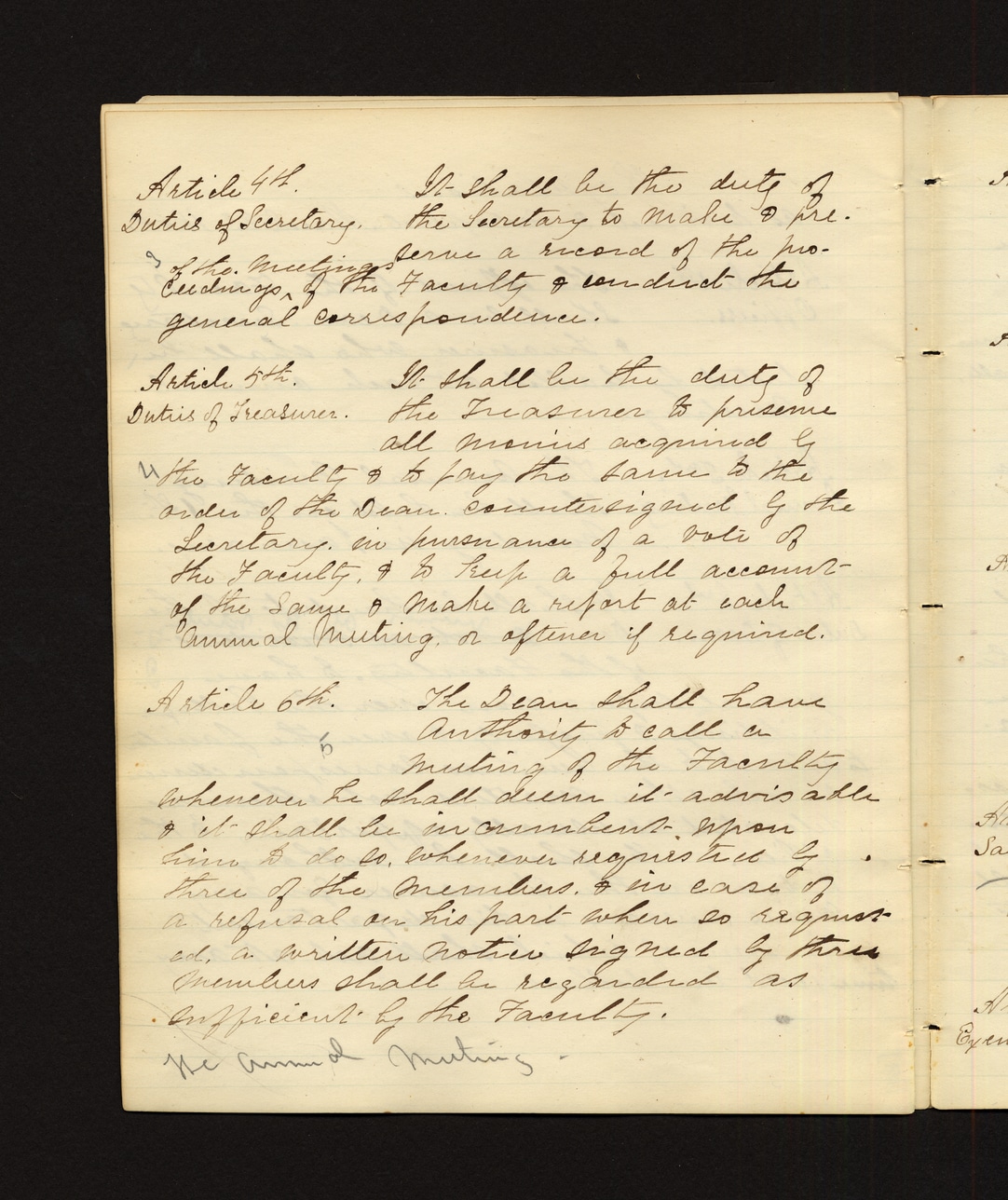 @file_a092_001_197_jpg -> contains -> [@article_4, @article_5, @article_6]Article 4th. It shall be the duty of Duties of Secretary, the Secretary to make & preserve a record of the proceedings of the meetings of the Faculty & conduct the general correspondence. Article 5th. It shall be the duty of Duties of Treasurer, the Treasurer to preserve all monies acquired by the Faculty & to pay the same to the order of the Dean, countersigned by the Secretary, in pursuance of a vote of the Faculty, & to keep a full account of the same & make a report at each Annual Meeting, or oftener if required. Article 6th. The Dean shall have authority to call a meeting of the Faculty whenever he shall deem it advisable & it shall be incumbent upon him to do so whenever requested by three of the Members, & in case of a refusal on his part when so requested, a written notice signed by those Members shall be regarded as sufficient by the Faculty.