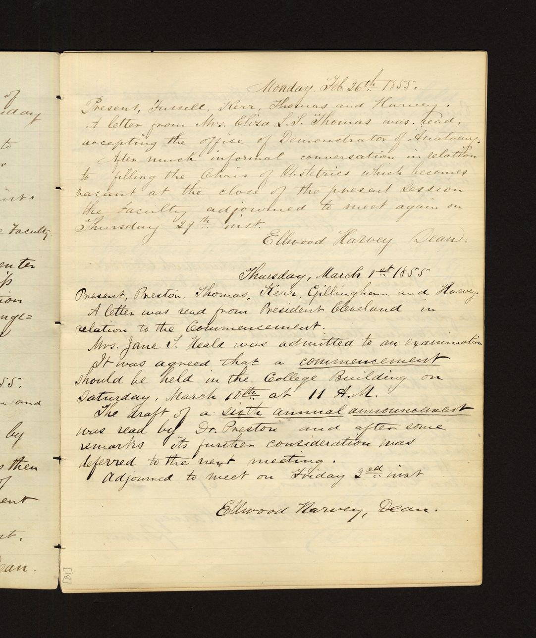 Monday, Feb 26th 1855. Present, Fennell, Kerr, Thomas and Harvey. A letter from Mrs. Eliza L.S. Thomas was read, accepting the office of Demonstrator of Anatomy. After much informal conversation in relation to filling the Chair of Obstetrics which becomes vacant at the close of the present session the Faculty adjourned to meet again on Thursday 27th inst. Ellwood Harvey Dean. Thursday, March 1st 1855 Present, Preston, Thomas, Kerr, Gillingham and Harvey. A letter was read from President Cleveland in relation to the Commencement. Mrs. Jane I. Neals was admitted to an examination. It was agreed that a commencement should be held in the College Building on Saturday, March 10th at 11 A.M. The draft of a sixth annual announcement was read by Dr. Preston and after some remarks its further consideration was deferred to the next meeting. Adjourned to meet on Friday 2nd inst. Ellwood Harvey, Dean.