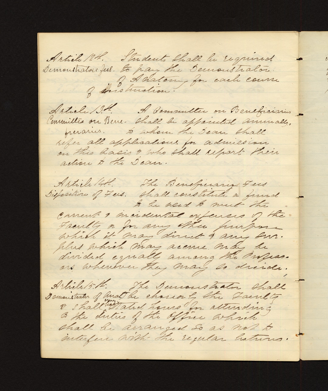 Article 124. Students shall be required to pay the Demonstrator's fees for each course of instruction. Article 134. A Committee on Beneficiaries shall be appointed annually, to whom the Dean shall refer all applications for admission on this basis & who shall report their actions to the Dean. Article 144. The Beneficiaries' Fees shall constitute a fund to be used to meet the current & incidental expenses of the Faculty or for any other purpose which it may direct & any surplus plus which may accrue may be divided equally among the Professors whenever they may so decide. Article 154. The Demonstrator shall be chosen by the Faculty & shall state hours for attending to the duties of the Office which shall be arranged so as not to interfere with the regular lectures.