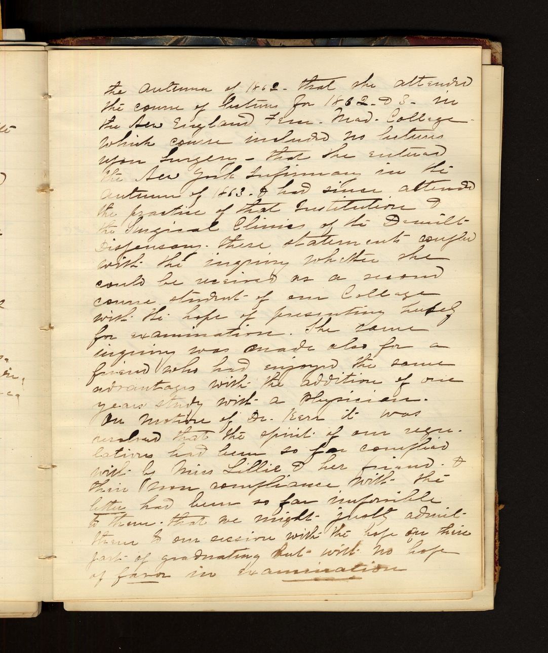 @file_a092_001_213_jpg -> documents -> @faculty_meeting_oct_31_1864the Autumn of 1862, that she attended the course of lectures for 1862-03 in the New England Free Med. College which course included no lectures upon Surgery—that she entered the New York Infirmary in the Autumn of 1863 & had since attended the practice of that Institution & the Surgical Clinics of the Dewitt Dispensary. These statements coupled with the inquiry whether she could be received as a second course student of our College with the hope of presenting herself for examination. The same inquiry was made also for a friend who had enjoyed the same advantages with the addition of one year's study with a Physician. On notice of Dr. Kerr it was resolved that the spirit of our regulations had been so far complied with by Miss Lillie & her friend & their own compliance with the latter had been so far impossible to them that we might—shall admit them to our session with the hope on their part of graduating but with no hope of favor in examination.