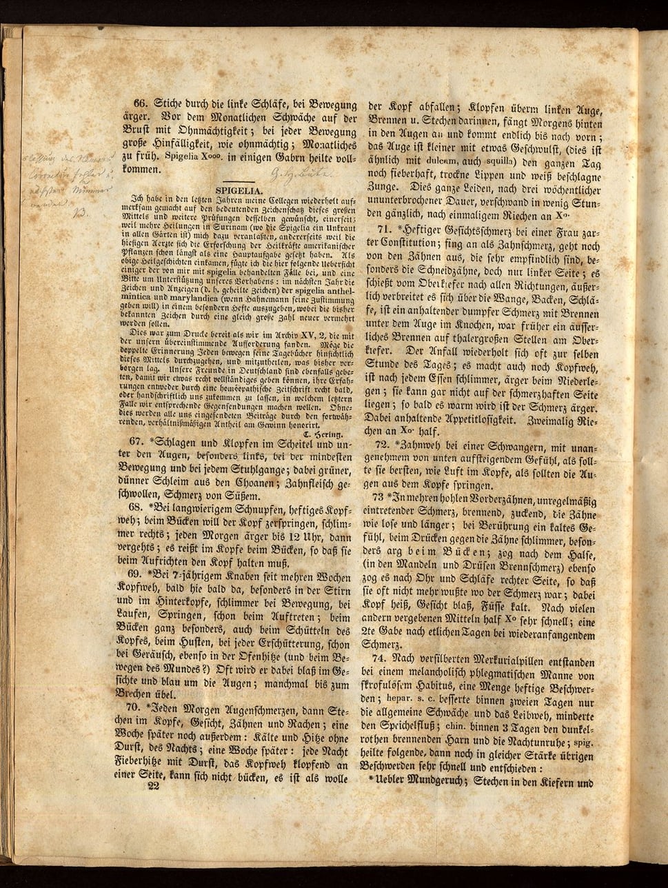 66. Stiche durch die linke Schlafse, bei Bewegung ärger. Vor dem Monatlichen Schwäche auf der Brust mit Ohnmachtigkeit; bei jeder Bewegung große Hinsfälligkeit, wie ohnmächtig; Monatliches zu früh. Spigelia Xoo. in einigen Gaben heilte vollkommen. SPIGELIA. Ich habe in den letzten Jahren meine Collegen wiederholt aufmerksam gemacht auf den bedeutenden Heilzweck dieses großen Mittels und weitere Prüfungen desselben gewünscht, einerseits weil mehrere Heilungen in Surinam (wo die Spigelia ein Unkraut in allen Gärten ist) mich dazu veranlassten, andererseits weil die hiesigen Ärzte sich die Erforschung der Heilkraft amerikanischer Pflanzen schon längst als eine Hauptaufgabe gesetzt haben. Als obige Beifüglichen einzumischen fügte ich die hier folgende Uebersicht an, die von mir mit spiegelhaften behandelt hat bei, und eine Mittel zur Unterhaltung unseres Werthwerks: im nächsten Jahr die Zeichen und Angaben (s. s. gehalte Zeiten) der spigelia anthelmintica und marylandica (wenn Zahlmengen seine Zustimmung geben will) in einem besonderen Hefte auszugeben, worin die bisher bekannten Zeichen durch eine gleich große Zahl neuer erneuert werden sollen. Dies war zum Dritte bereit als wir im Archiv XV. 2. die mit der unsern übereinstimmende Ausforderung fanden. Wege die doppelte Erinnerung jeden bewogen seine Tagebücher hinsichtlich dieses Mittels durchzugehen, und mitzuheissen, was bisher verborgen lag. Unsere Freunde in Deutschland sind ebenfalls gebeten, damit wir etwas recht vollständiges geben können, ihrer Erfahrung nach anderer durch eine heimwehreiche Zeitschrift recht bald, oder handschriftlich uns zuzuführen zu lassen, in welchem letzten Falle wir entsprechende Gegenbemerkungen machen wollen. Ohne dies werden alle uns eingefundenen Beiträge durch den fortwährenden, verschlankenden Anteil am Gewinn hineingehen. 67. *Schlagen und Klopfen im Scheitel und unter den Augen, besonders links, bei der mindesten Bewegung und bei jedem Stuhlgange; dabei grüner, dünner Schleim aus den Choanen; Zahnfleisch geschwollen, Schmerz von Süßem. 68. *Bei langwierigem Schnupfen, heftiges Kopfschweh; beim Bücken will der Kopf zerspringen, schlummer rechts; jeden Morgen ärger bis 12 Uhr, dann vergeht's; es reist im Kopfe beim Bücken, so daß sie beim Aufrichten den Kopf halten muß. 69. *Bei 7-jährigem Knaben seit mehreren Wochen Kopfschweh, bald hier bald da, besonders in der Stirn und im Hinterkopfe, schlimmer bei Bewegung, bei Laufen, Springen, schon beim Aufrichten; beim Bücken ganz besonders, auch beim Schütteln des Kopfes, beim Husten, bei jeder Erschütterung, schon bei Geräusch, ebenso in der Öffnisse (und beim Bewegen des Mundes?) Oft wird er dabei bläf im Gesichte und blau um die Augen; manchmal bis zum Brechen äbel. 70. *Jeden Morgen Augenschmerzen, dann Stechen im Kopfe, Gesicht, Zähnen und Nachen; eine Woche später noch ausserdem: Kälte und Hisse ohne Durst, des Nachts; eine Woche später: jede Nacht Fieberhöhe mit Durst, das Kopfschweh klopfend an einer Seite, kann sich nicht bücken, es ist als wolle der Kopf abfallen; Klopfen überm linken Auge, Bremmen u. Stechen darinnen, fängt Morgens hinten in den Augen an und kommt endlich bis nach vorn; das Auge ist kleiner mit etwas Geschwulst, (dies ist ähnlich mit dulsem, auch squilla) den ganzen Tag noch sieberhaft, trockne Lippen und weiss beschlagene Zunge. Dies ganze Leiden, nach drei wöchentlicher ununterbrochener Dauer, verschwand in wenig Stunden ganzlich, nach einmaligem Riechen an Xo. 71. *Heftiger Gesichtsschmerz bei einer Frau zar- ter Constitution; singt an als Zahnschmerz, geht noch von den Zähnen aus, die sehr empfindlich sind, besonders die Schneidzähne, doch nur linker Seite; es schließt vom Oberkiefer nach allen Richtungen, äußerlich verbreitet es sich über die Wangen, Backen, Schlafse, ist ein anhaltender dumpfer Schmerz mit Brennen unter dem Auge im Knochen, war früher ein äußerliches Brennen auf thalergrossen Stellen am Oberkiefer. Der Anfall wiederholt sich oft zur selben Stunde des Tages; es macht auch noch Kopfschweh, ist nach jedem Essen schlummer, ärger beim Niederlegen; sie kann gar nicht auf der schmerzhaften Seite liegen; so bald es warm wird ist der Schmerz ärger. Dabei anhaltende Appetitlosigkeit. Zweimalig Riechen an Xo half. 72. *Zahnweh bei einer Schwangeren, mit unangenehmem von unten aufsteigendem Gefühl, als sollte sie bersten, wie Luft im Kopfe, als sollten die Augen aus dem Kopfe springen. 73.*In mehreren hohlen Borderzähnen, unregelmäßig eintretender Schmerz, brennend, zuckend, die Zähne wie lose und länger; bei Berührung ein kaltes Gefühl, beim Drüften gegen die Zähne schlummer, besonders arg beim Bücken; zog nach dem Halse, (in den Mandeln und Drüsen Brennschmerz) ebenso zog es nach Ohr und Schlafse rechter Seite, so daß sie oft nicht mehr wusste wo der Schmerz war; dabei Kopf heiß, Gesicht blau, Füße kalt. Nach vielen andern vergebenen Mitteln half Xo sehr schnell; eine Rte Gabe nach etlichen Tagen bei wiederansangendem Schmerz. 74. Nach versilberten Merkurialpillsen entstanden bei einem melancholisch phlegmatischen Manne von krofulössem Habitus, eine Menge heftige Beschwerden; hepär. s. c. besterte binnen zweien Tagen nur die allgemeine Schwäche und das Leibweh, minderte den Speichelfluß; chin. binnen 3 Tagen den dunkelrothen brennenden Harn und die Nachtunruhe; spig. heilte folgende, dann noch in gleicher Stärke übrigen Beschwerden sehr schnell und entschieden: *Uebler Mundgeruch; Stechen in den Kiefern und