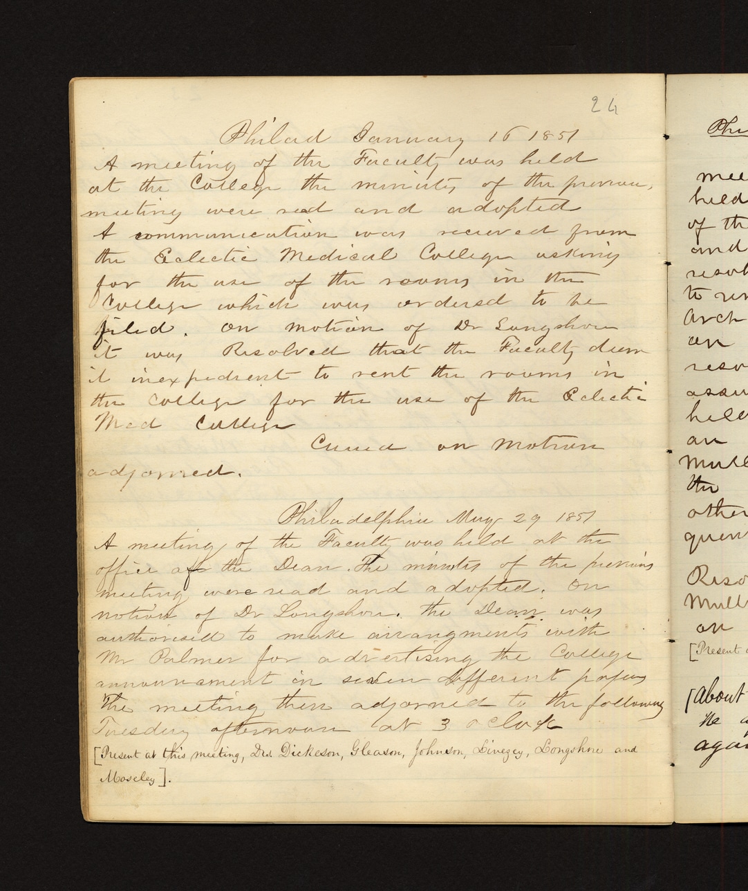 Philadelphia January 16, 1851 A meeting of the Faculty was held at the College. The minutes of the previous meeting were read and adopted. A communication was received from the Eclectic Medical College asking for the use of the rooms in the College which was ordered to be filed. On motion of Dr Longshore it was resolved that the Faculty deem it inexpedient to rent the rooms in the College for the use of the Eclectic Medical College. Came on motion adjourned. Philadelphia May 29, 1851 A meeting of the Faculty was held at the office of the Dean. The minutes of the previous meeting were read and adopted. On motion of Dr Longshore, the Dean was authorized to make arrangements with Mr Palmer for advertising the College announcement in several different papers. The meeting then adjourned to the following Tuesday afternoon at 3 o'clock. [Present at this meeting, Drs. Dickeson, Gleason, Johnson, Linsley, Longshore and Moseley].