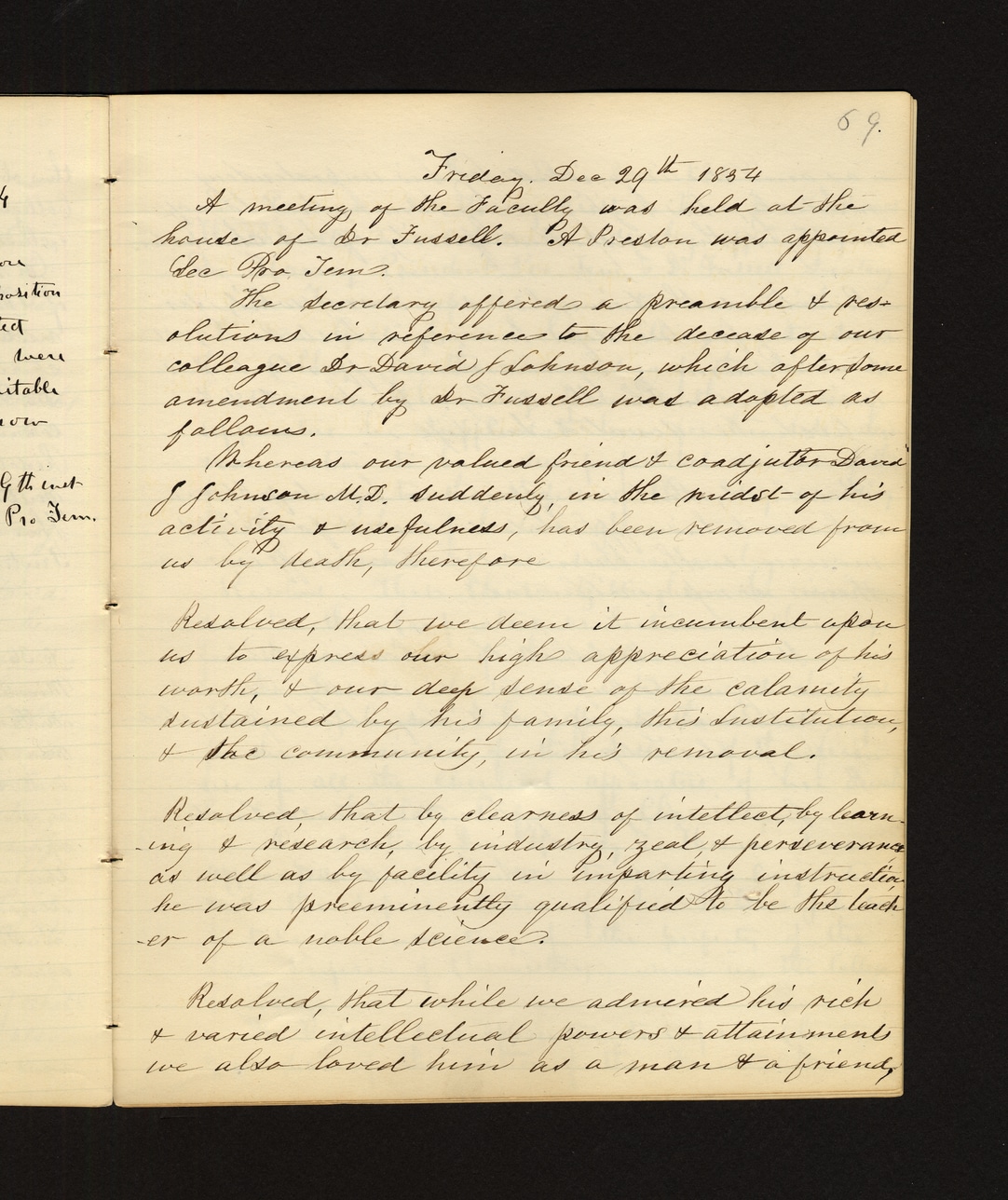 Friday, Dec 29th 1854 A meeting of the Faculty was held at the house of Dr Fussell. A Preston was appointed Sec Pro Tem. The Secretary offered a preamble & resolutions in reference to the decease of our colleague Dr David J Johnson, which after some amendment by Dr Fussell was adopted as follows. Whereas our valued friend & coadjutor David J Johnson M.D. Suddenly, in the midst of his activity & usefulness, has been removed from us by death, therefore Resolved, that we deem it incumbent upon us to express our high appreciation of his worth, & our deep sense of the calamity sustained by his family, this Institution, & the community, in his removal. Resolved, that by clearness of intellect, by learning & research, by industry, zeal & perseverance as well as by facility in imparting instruction he was preeminently qualified to be the teacher of a noble science. Resolved, that while we admired his rich & varied intellectual powers & attainments we also loved him as a man & a friend.