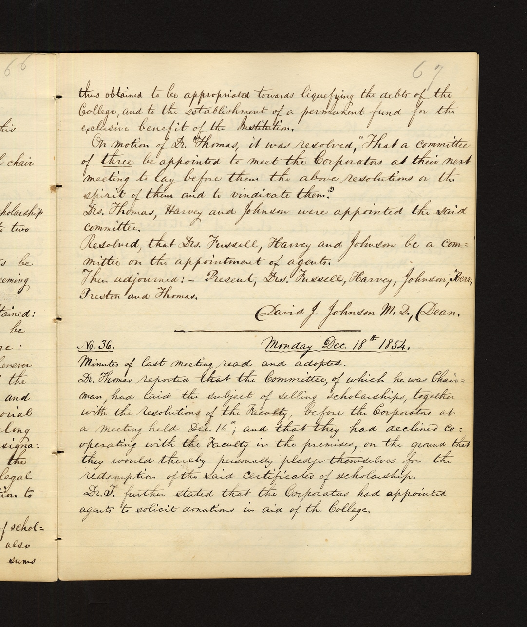 thus obtained to be appropriated towards liquefying the debts of the College, and to the establishment of a permanent fund for the exclusive benefit of the Institution. On motion of Dr. Thomas, it was resolved, "That a committee of three be appointed to meet the Corporators at their next meeting to lay before them the above resolutions or the spirit of them and to vindicate them." Dr. Thomas, Harvey and Johnson were appointed the said committee. Resolved, that Drs. Fussell, Harvey and Johnson be a committee on the appointment of agents. Then adjourned: - Present, Drs. Fussell, Harvey, Johnson, Kerr, Preston and Thomas. David J. Johnson M.D., Dean. No. 36. Monday Dec. 18th 1854. Minutes of last meeting read and adopted. Dr. Thomas reported that the Committee, of which he was Chairman, had laid the subject of selling scholarships, together with the Resolutions of the Faculty, before the Corporators at a meeting held Dec. 16th; and that they had declined cooperating with the Faculty in the premises, on the ground that they would thereby personally pledge themselves for the redemption of the said Certificates of Scholarship. Dr. T. further stated that the Corporators had appointed agents to solicit donations in aid of the College.
