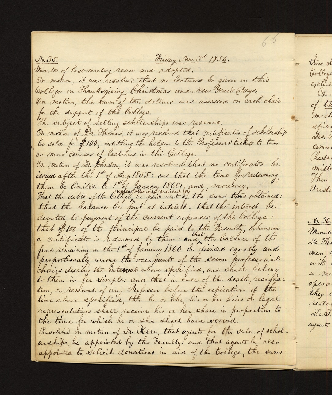 @t_fussell -> edited -> @memorial_resolution {role: "Secretary Pro Tem"}No. 35. Friday Nov. 3rd 1854. Minutes of last meeting read and adopted. On motion, it was resolved that no lectures be given in this College on Thanksgiving, Christmas and New Year's Days. On motion, the sum of ten dollars was assessed on each chair for the support of the College. The subject of selling scholarships was resumed. On motion of Dr. Thomas, it was resolved that certificates of scholarship be sold for $100, entitling the holder to the Professors' tickets to two or more courses of lectures in this College. On motion of Dr. Johnson, it was resolved that no certificates be issued after the 1st of Aug. 1855; and that the time for redeeming them be limited to 1st of January 1860; and, moreover, that the debts of the College be paid out of the sums thus obtained: that the balance be put at interest: that the interest be devoted to payment of the current expenses of the College: that $100 of the principal be paid to the Faculty, whenever a certificate is redeemed by them: and that the balance of the fund remaining on the 1st of January 1860 be divided equally and proportionally among the occupants of the seven professional chairs during the interval above specified, and shall belong to them in fee simple: and that in case of the death, resignation, or removal of any Professor before the expiration of the time above specified, then he or she, his or her heirs or legal representatives shall receive his or her share in proportion to the time for which he or she shall have served. Resolved, on motion of Dr. Kerr, that agents for the sale of scholarships be appointed by the Faculty: and that agents be also appointed to solicit donations in aid of the College, the sums