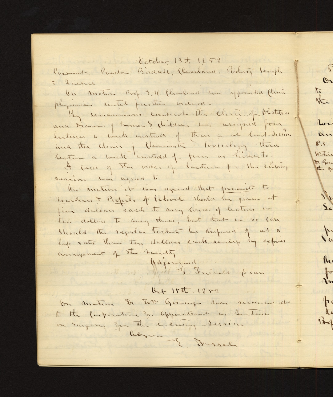 October 13th, 1852 Present: Preston, Birdwell, Cleveland, Rodney, Temple & Furrell On motion Prof. E.H. Cleveland was appointed clinic physician until further ordered. By unanimous consent the chair of obstetrics and diseases of women & children was assigned four lectures a week instead of three as at last session and the chair of chemistry & toxicology three lectures a week instead of four as hitherto. A card of the order of lectures for the ensuing session was agreed to. On motion it was agreed that permits to teachers & pupils of schools should be given at five dollars each to any course of lectures or ten dollars to any other; but that in no case should the regular tickets be disposed of at a lower rate than ten dollars each, merely by express arrangement of the faculty. Adjourned E. Furrell, Dean Oct 15th, 1852 On motion Dr. Wm Gorminge was recommended to the corporation for appointment as lecturer on surgery for the ensuing session. Adjourned E. Furrell