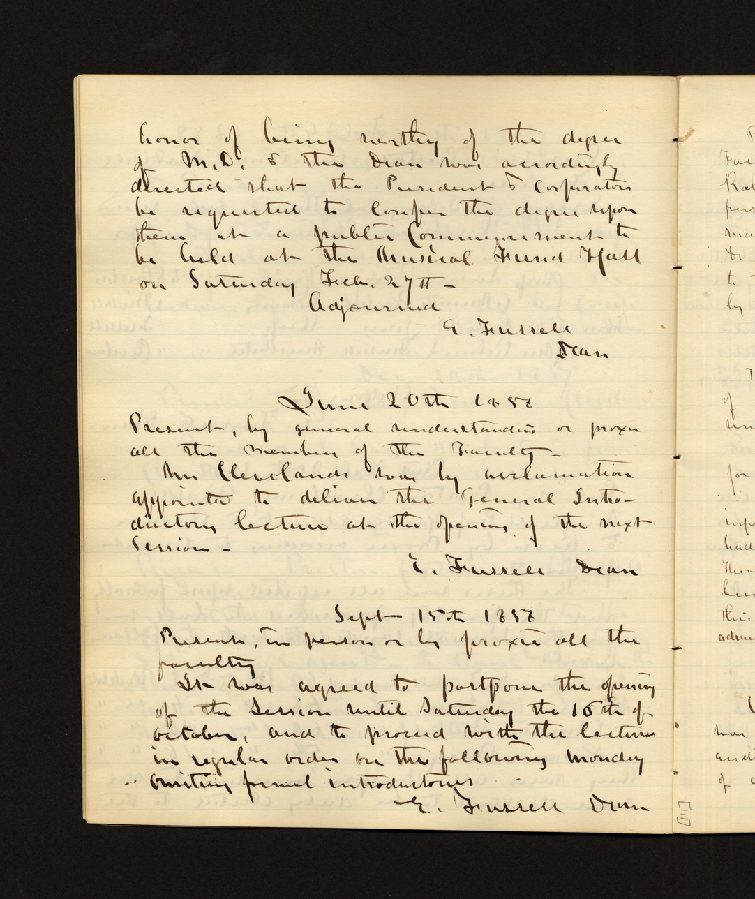 honor of being worthy of the degree of M.D., & this Dean was accordingly directed that the President & Corporators be requested to confer the degree upon them at a public commencement to be held at the Musical Fund Hall on Saturday, Feb. 27th. Adjourned E. Furseil Dean June 20th, 1858 Present, by general understanding or proxy all the members of the faculty. Mr. Cleveland Dean by acclamation appointed to deliver the General Introductory lecture at the opening of the next session. E. Furseil Dean Sept. 15th, 1858 Present, in person or by proxy all the faculty. It was agreed to postpone the opening of the session until Saturday the 16th of October, and to proceed with the lectures in regular order on the following Monday omitting formal introductions. E. Furseil Dean