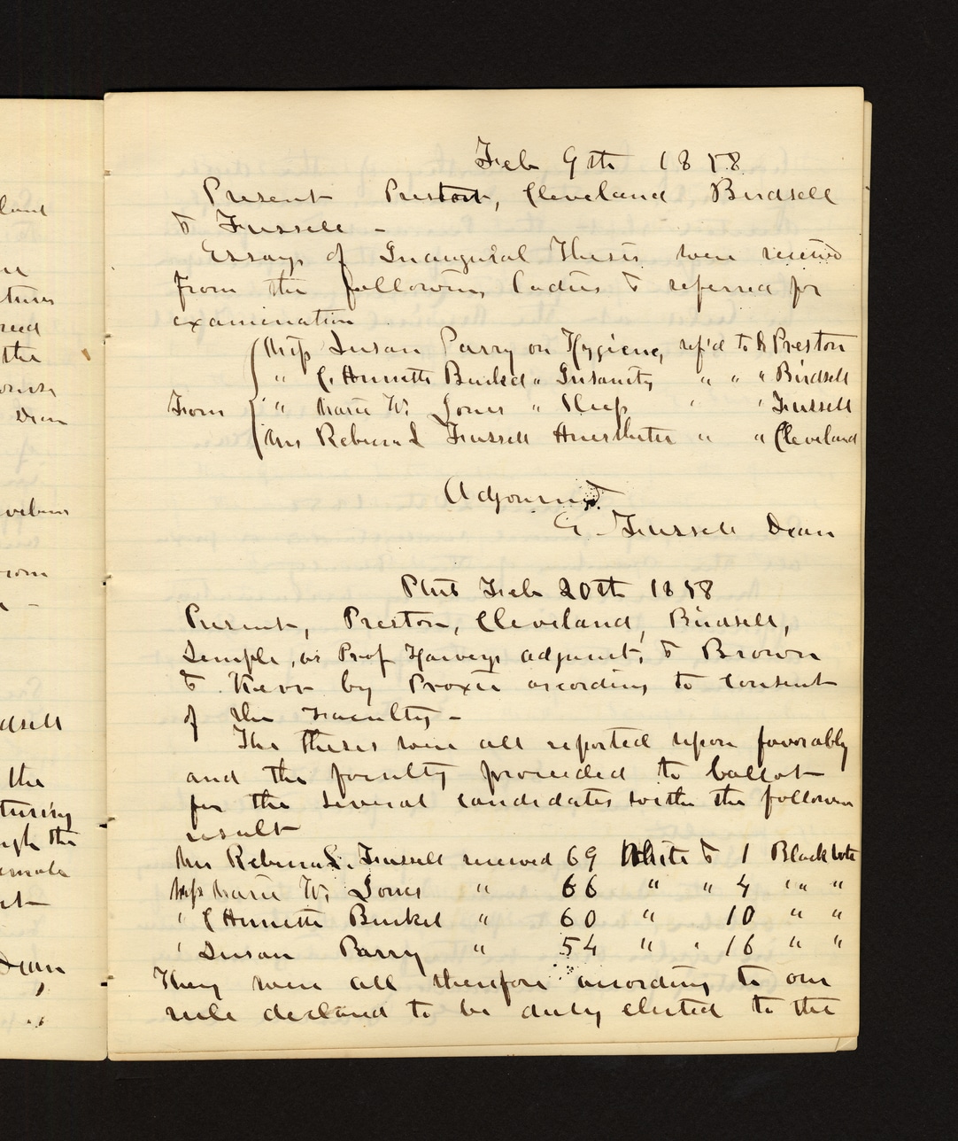 @file_a092_001_118_jpg -> documents -> @meeting_feb_3_1859 Feb 9th, 1858 Present: Preston, Cleveland, Bradell & Finselle. Essay of Inaugural Thesis were received from the following ladies & referred for examination: Miss Susan Parry on Hygiene, referred to Preston C. Henrietta Buckel on Insanity referred to Bradell Mrs. Hannah W. Jones on Sleep referred to Finselle Mrs. Rebecca Finselle as an Honorary member referred to Cleveland Adjourned. G. Finselle Dean Plus Feb 20th, 1858 Present: Preston, Cleveland, Bradell, Temple, & Prof. Harvey adjoint; & Brown to be on by proxy according to request of the faculty. The thesis were all reported before favorably and the faculty proceeded to ballot for the several candidates with the following result: Mrs. Rebecca Finselle received 69 White to 1 Black vote Mrs. Hannah W. Jones " 66 " " 4 " C. Henrietta Buckel " 60 " " 10 " Susan Parry " 54 " " 16 " They were all therefore, according to our rule declared to be duly elected to the