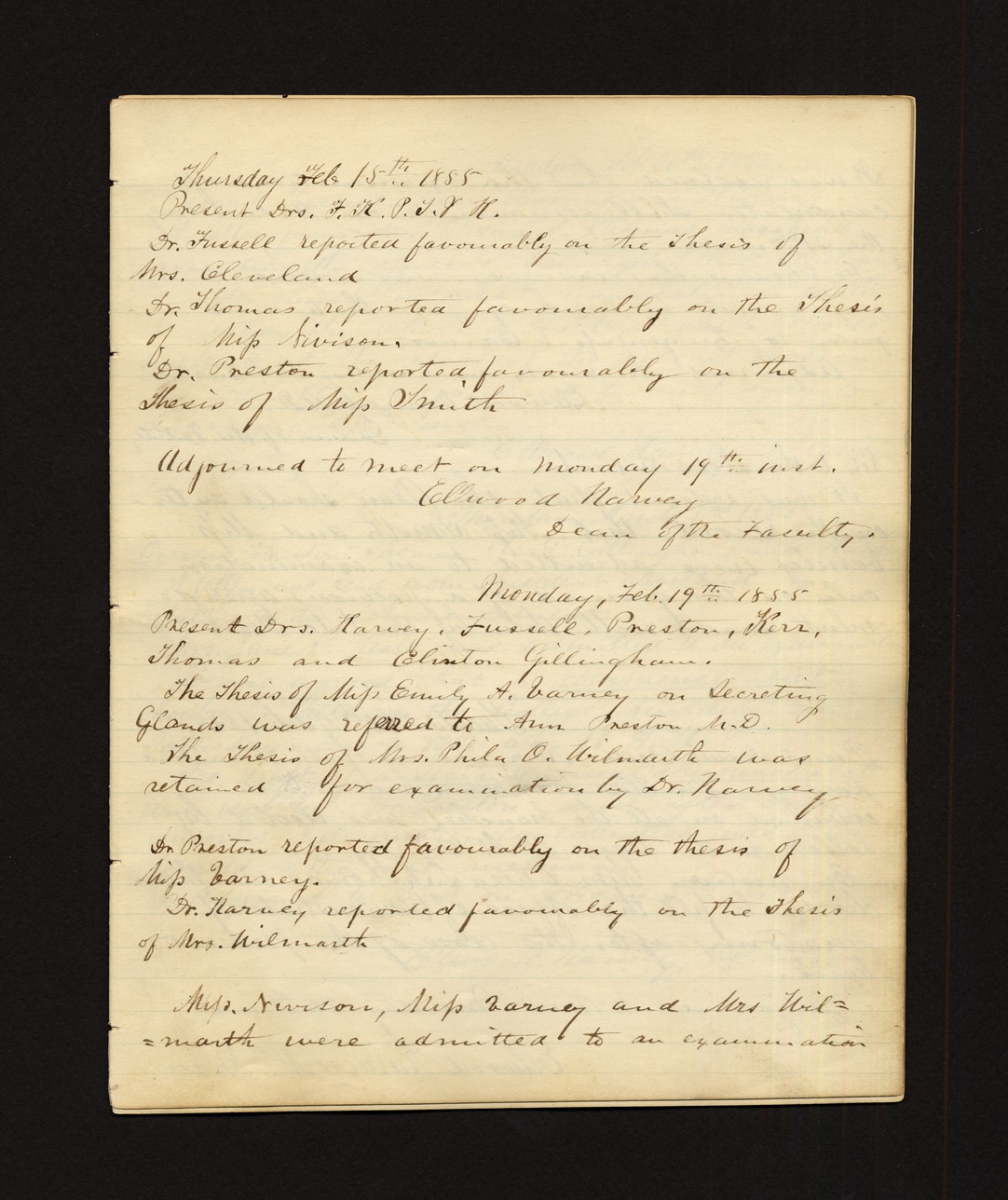 @file_a092_001_097_jpg -> documents -> @degree_conferment_feb_28_1856:eventThursday Feb 15th 1855 Present Drs. F. H. P. J. T. H. Dr. Fussell reported favourably on the thesis of Mrs. Cleveland Dr. Thomas reported favourably on the thesis of Miss Nivison. Dr. Preston reported favourably on the thesis of Miss Smith. Adjourned to meet on Monday 19th inst. Ellwood Harvey Dean of the Faculty Monday, Feb. 19th 1855 Present Drs. Harvey, Fussell, Preston, Kerr, Thomas and Clinton Gillingham. The thesis of Miss Emily A. Barney on Secreting Glands was referred to Ann Preston M.D. The thesis of Mrs. Phila O. Wilmarth was retained for examination by Dr. Harvey. Dr. Preston reported favourably on the thesis of Miss Barney. Dr. Harvey reported favourably on the thesis of Mrs. Wilmarth. Miss Nivison, Miss Barney and Mrs. Wilmarth were admitted to an examination.