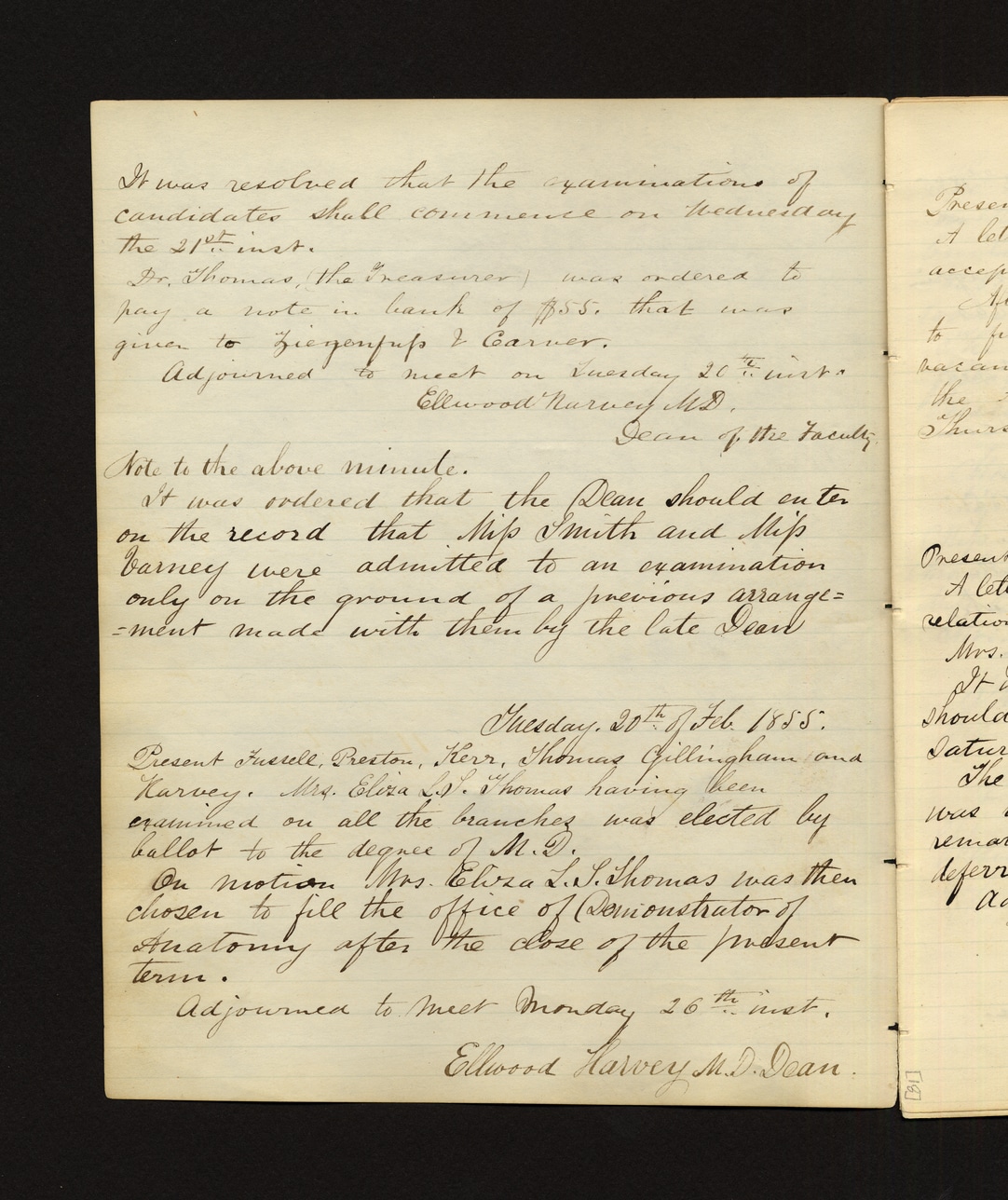 It was resolved that the examinations of candidates shall commence on Wednesday the 21st inst. Dr. Thomas, (the Treasurer) was ordered to pay a note in hand of $55. that was given to Ziegenfus & Carver. Adjourned to meet on Tuesday 20th inst. Ellwood Harvey M.D. Dean of the Faculty Note to the above minute. It was ordered that the Dean should enter on the record that Misp Smith and Misp Barney were admitted to an examination only on the ground of a previous arrangement made with them by the late Dean. Tuesday, 20th Feb. 1855. Present Russell, Preston, Kerr, Thomas, Gillingham and Harvey. Mrs. Eliza L.S. Thomas having been examined on all the branches was elected by ballot to the degree of M.D. On motion Mrs. Eliza L.S. Thomas was then chosen to fill the office of Demonstrator of Anatomy after the close of the present term. Adjourned to Meet Monday 16th inst. Ellwood Harvey M.D. Dean