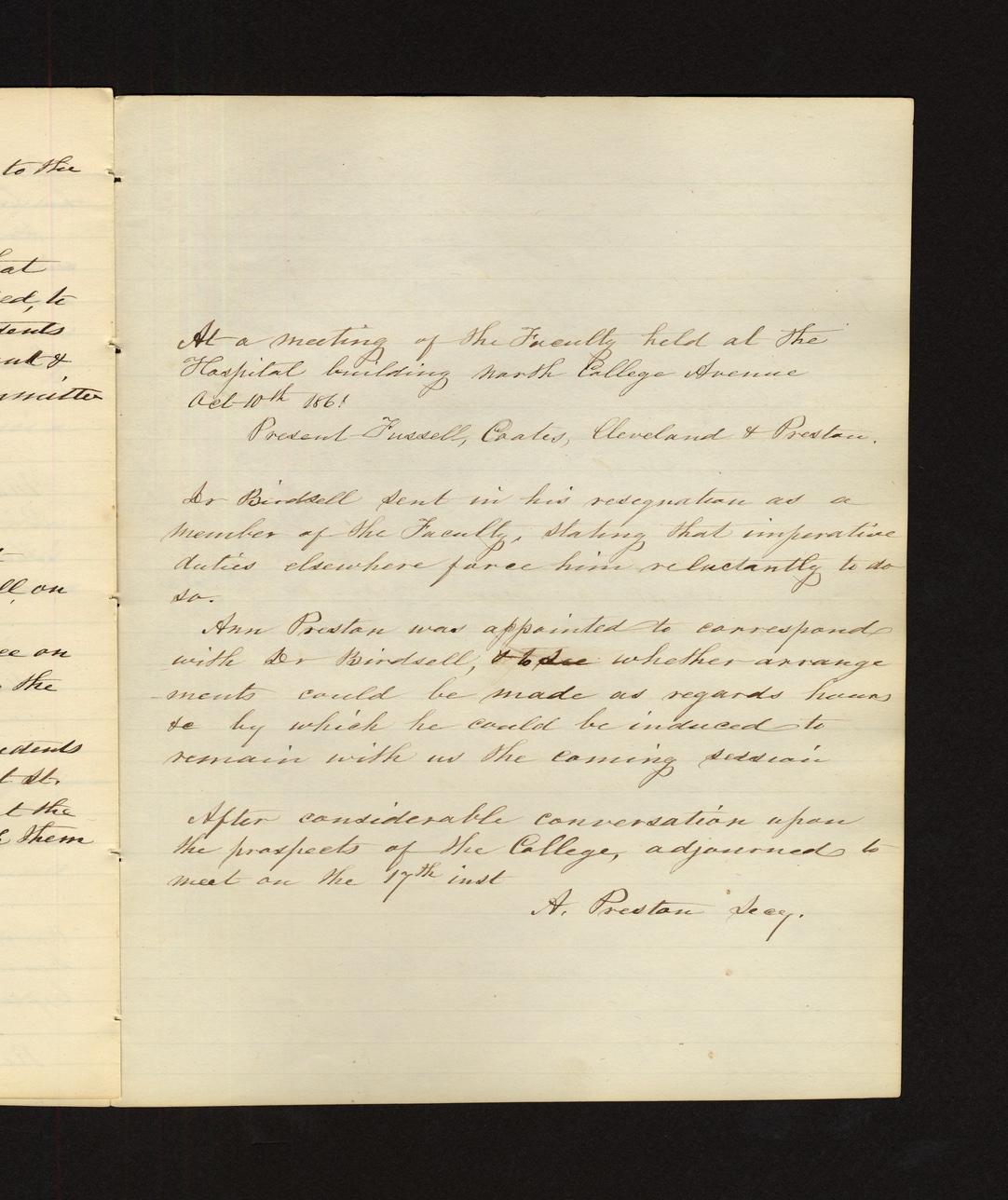 @academic_session_1861_1862:concept {description: "College teaching term scheduled for 1861‑1862"} At a meeting of the Faculty held at the Hospital building North College Avenue Oct 10th 1861 Present: Tinsell, Coates, Cleveland & Preston. Dr Birdsell sent in his resignation as a member of the Faculty, stating that imperative duties elsewhere force him reluctantly to do so. Ann Preston was appointed to correspond with Dr Binstoll, & to see whether arrangements could be made as regards himself by which he could be induced to remain with us the coming session. After considerable conversation upon the prospects of the College, adjourned to meet on the 17th inst A. Preston secy.