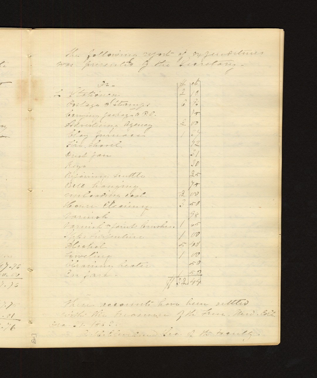 The following report of expenditures was presented by the Secretary. <table> <tr> <th>Description</th> <th>#</th> <th>ct</th> </tr> <tr> <td>Stationery</td> <td>2</td> <td>10</td> </tr> <tr> <td>Postage & Stamps</td> <td>6</td> <td>90</td> </tr> <tr> <td>Carrying packages P.O.</td> <td></td> <td>15</td> </tr> <tr> <td>Advertising Agency</td> <td>2</td> <td>00</td> </tr> <tr> <td>Gas Furnace</td> <td></td> <td>39</td> </tr> <tr> <td>Tin Church</td> <td></td> <td>42</td> </tr> <tr> <td>Dust pan</td> <td></td> <td>21</td> </tr> <tr> <td>Keys</td> <td></td> <td>30</td> </tr> <tr> <td>Repairing settle</td> <td></td> <td>25</td> </tr> <tr> <td>Bell hanging</td> <td></td> <td>75</td> </tr> <tr> <td>Unloading coal</td> <td></td> <td>200</td> </tr> <tr> <td>House Cleaning</td> <td></td> <td>50</td> </tr> <tr> <td>Varnish</td> <td></td> <td>98</td> </tr> <tr> <td>Varnish & paint brushes</td> <td></td> <td>105</td> </tr> <tr> <td>Spittoon</td> <td></td> <td>100</td> </tr> <tr> <td>Alcohol</td> <td></td> <td>510</td> </tr> <tr> <td>Toweling</td> <td></td> <td>100</td> </tr> <tr> <td>Steamy heater</td> <td></td> <td>50</td> </tr> <tr> <td>En fare</td> <td></td> <td>50</td> </tr> <tr> <td colspan="2"><b>Total</b></td> <td><b>$2.47</b></td> </tr> </table> These accounts have been settled with the treasurer of the Free Med. Coll. Dec. 1, 1868. To be signed Sec'y of the Monthly.