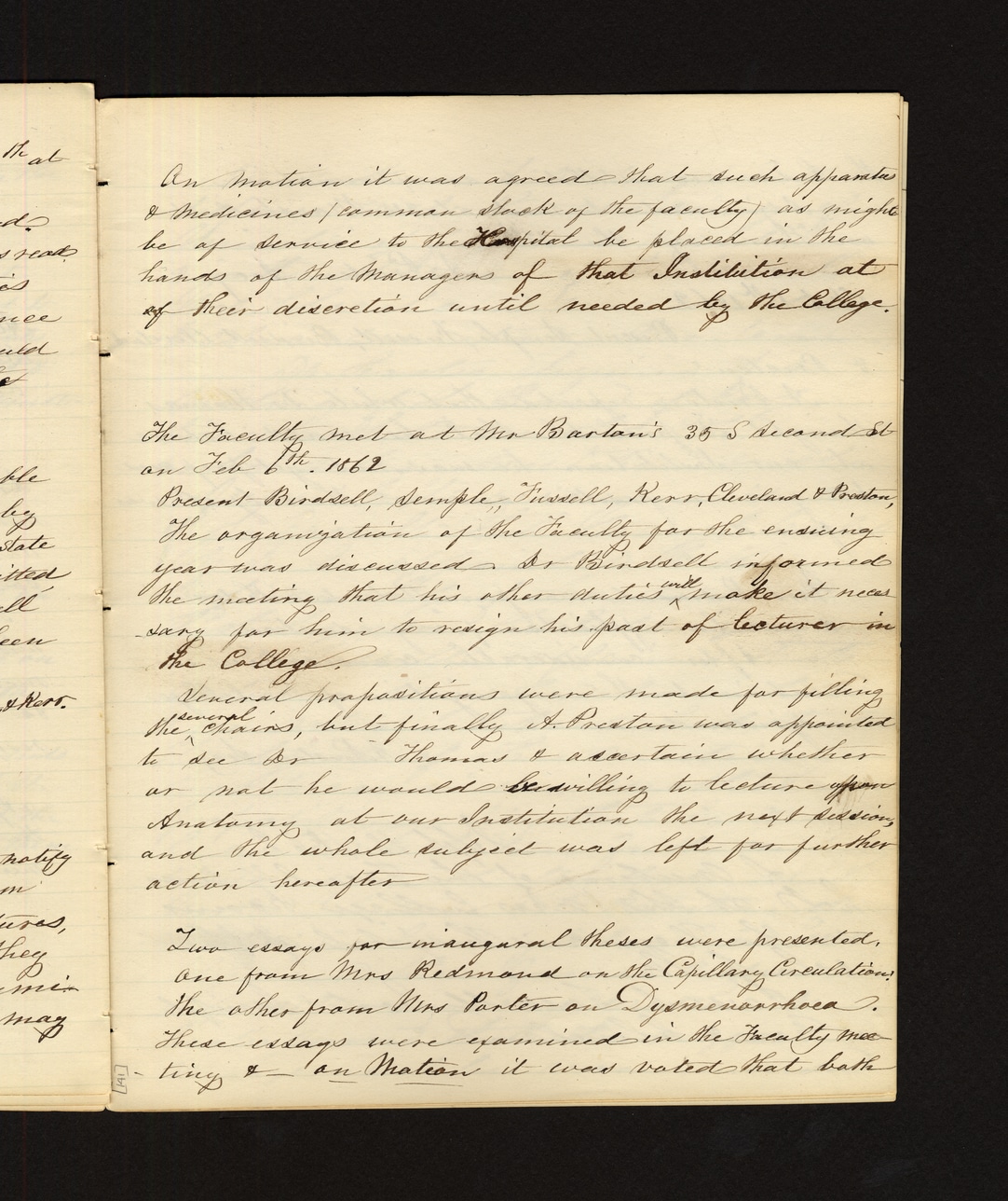 *All entities created above are specific to the 1862 Faculty Meeting archive; common‑knowledge entities such as @philadelphia, @united_states, @date_1862_02_06, etc., are referenced without definition.*An motion it was agreed that such apparatus & medicines (cannons stock of the faculty) as might be of service to the Hospital be placed in the hands of the Managers of that Institution at of their discretion until needed by the College. The Faculty met at Mr. Barton's 35 S Decand St on Feb 6th, 1862 Present: Birdsell, Semple, Finsell, Revr. Cleveland & Boston. The organization of the Faculty for the ensuing year was discussed. Dr. Birdsell informed the meeting that his other duties would make it necessary for him to resign his post of lecturer in the College. Several propositions were made for filling the vacant chairs, but finally A. Preston was appointed to see Dr. Thomas & ascertain whether or not he would be willing to lecture upon Anatomy at our Institution the next session, and the whole subject was left for further action hereafter. Two essays for inaugural theses were presented, one from Mrs. Redmond on the Capillary Circulation. The other from Mrs. Parter on Dysmenorrhoea. These essays were examined in the Faculty meeting & an motion it was voted that both