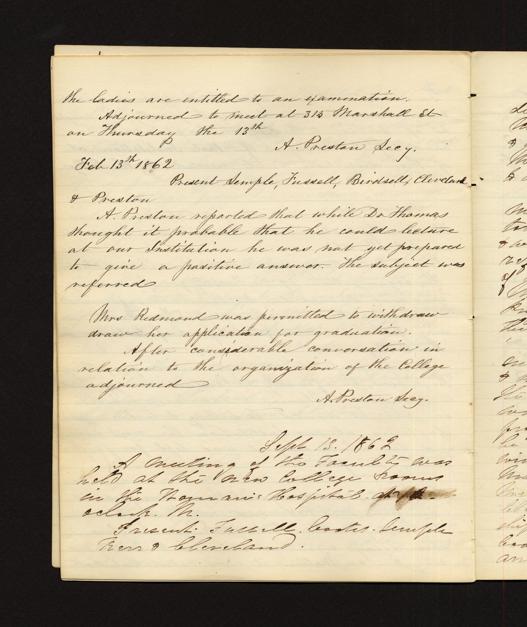 The ladies are entitled to an examination. Adjourned to meet at 315 Marshall St on Thursday the 13th A. Preston Secy. Feb 13th 1862 Present: Temple, Fussell, Birdsell, Cleveland & Preston A. Preston reported that while Dr Thomas thought it probable that he could lecture at our Institution he was not yet prepared to give a positive answer. The subject was referred. Mrs Redmond was permitted to withdraw her application for graduation. After considerable conversation in relation to the organization of the College adjourned A. Preston Secy. Sept 13, 1862 A meeting of the Faculty was held at the New College Rooms in the Wagner's Hospital at 4 o'clock P.M. Present: Fussell, Coates, Temple, Kerr & Cleveland.