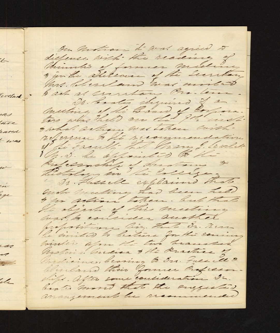 On Motion it was agreed to defence with the reading of minutes of former meeting & in the absence of the Secretary Mrs. Cleveland was invited to act as Corr. Pro-Tem. Dr. Locatis informed of a meeting of the Board of Corpora- tions which was held on the 1st inst. & what action was taken with reference to the recommendation of the faculty that Messrs. E. Leech & A.D. be appointed to the Professorship of Anatomy & Histology in the College. Dr. Russell explained that such meeting had been held & no action taken, but that the object of this meeting was to consider another proposition viz. that Dr. Kern be invited to lecture for the coming winter upon the two branches Material Medicine & the Practice of Medicine, leaving to Drs. Russell & Cleveland their former professor- ships. After some consideration Dr. Locatis moved that the suggested arrangement be recommended.