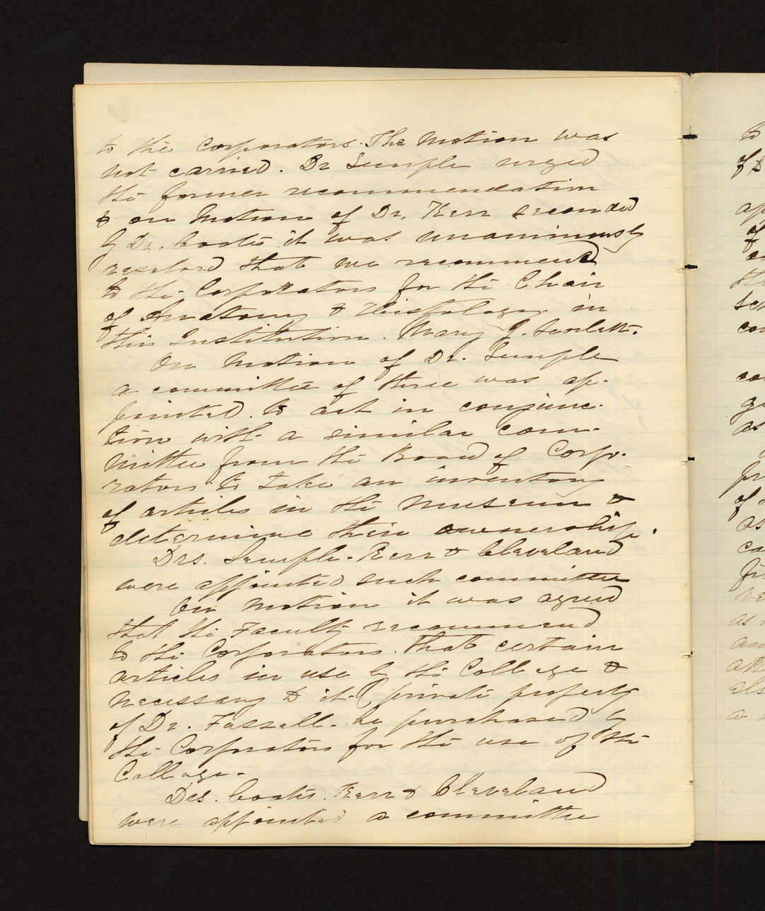 to the Corporators. The motion was not carried. Dr. Temple urged his former recommendation & on motion of Dr. Herr seconded by Dr. Booth it was unanimously resolved that we recommend to the Corporators for the Chair of Anatomy & Physiology in this Institution, Mary T. Fassell. On motion of Dr. Temple a committee of three was appointed to act in conjunction with a similar committee from the Board of Corporators to take an inventory of articles in the Museum & determine their ownership. Drs. Temple, Kerr & Cleveland were appointed such committee. On motion it was agreed that the Faculty recommend to the Corporators that certain articles in use by the College & necessary to its private property of Dr. Fassell be purchased by the Corporators for the use of the College. Drs. Booth, Kerr & Cleveland were appointed a committee