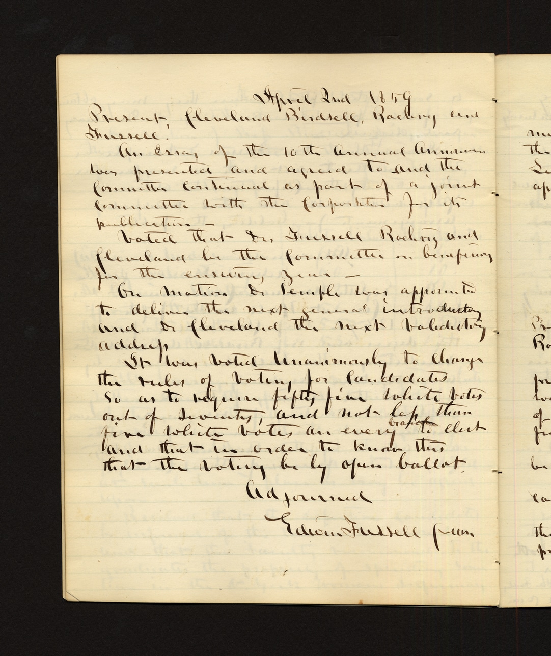 April 2nd, 1859 Present: Cleveland, Birdsell, Rockey and Thorell. An essay of the 10th Annual Anniversary was presented and agreed to and the committee continued as part of a joint committee with the corporation for its publication. Voted that Dr. Fessell, Rockey and Cleveland be the committee on banqueting for the ensuing year. On motion Dr Temple was appointed to deliver the next general introductory and Dr Cleveland the next valedictory address. It was voted unanimously to change the rules of voting for candidates so as to require fifty five white votes out of seventy, and not less than five white votes in every tribe to elect and that in order to know this, that the voting be by open ballot. Adjourneled Edwin Birdsell pres.