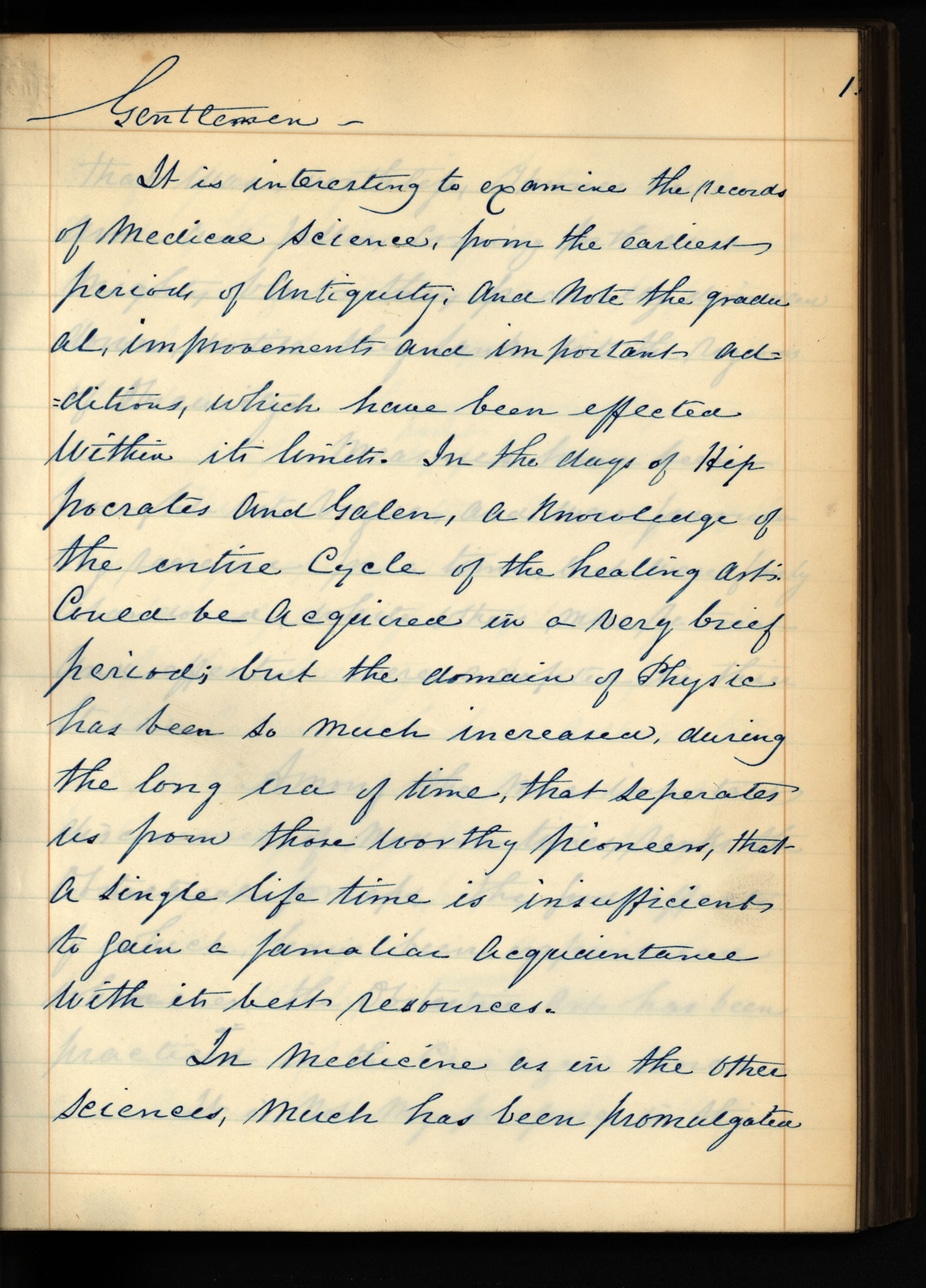Gentlemen - It is interesting to examine the records of Medical Science, from the earliest period of Antiquity, and note the gradual improvements and important additions, which have been effected within its limits. In the days of Hippocrates and Galen, a knowledge of the entire cycle of the healing arts could be acquired in a very brief period; but the domain of Physic has been so much increased, during the long era of time, that separates us from those worthy pioneers, that a single lifetime is insufficient to gain a familiar acquaintance with its best resources. In Medicine as in the other Sciences, much has been promulgated