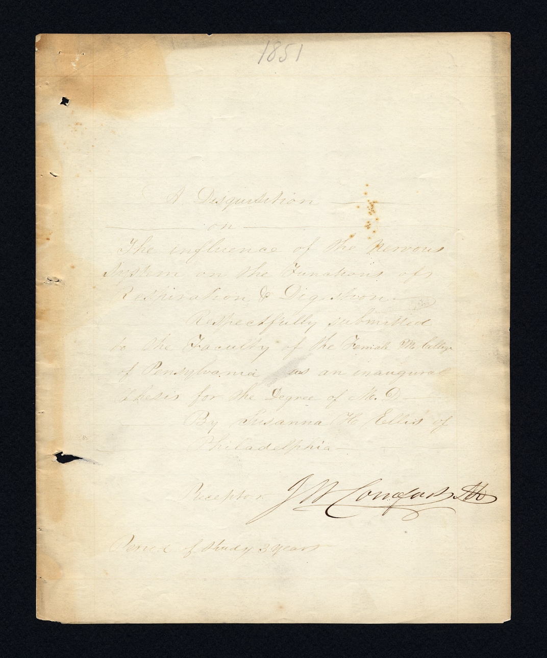 Susanna H. Ellis was an early female medical student in the United States. The dissertation was produced during a period when medical education was largely male‑dominated, and the Pennsylvania Medical College was one of the few institutions offering formal medical training in the region. The work was addressed to Dr. J. M. Conforth, M.D., who served as the dissertation’s recipient. Although the metadata lists Drexel University as the institution, Drexel was not founded until 1891; the dissertation’s provenance is correctly tied to the Pennsylvania Medical College in Philadelphia.
