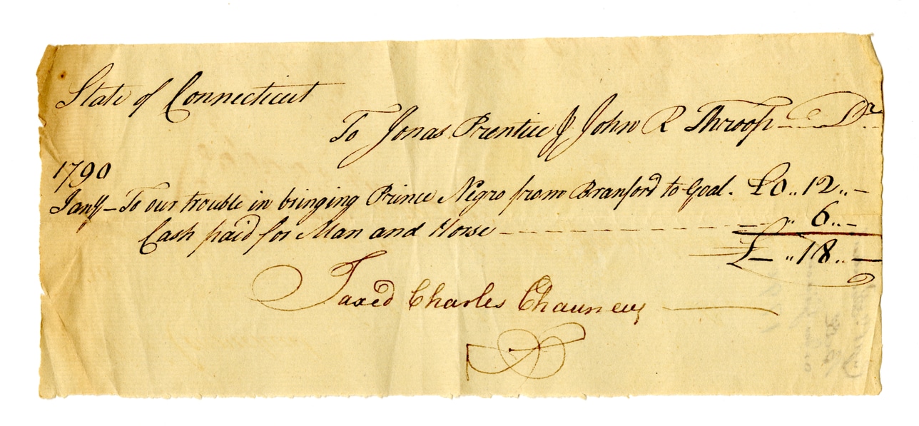 @ocr_text_001 -> mentions -> [@prince_negro, @jonas_pantue, @john_r_throop, @charles_chauncey, @branford, @new_haven] {when: @date_1790}State of Connecticut To Jonas Pantue & John R Throop Esq. 1790 Jan'y - To our trouble in bringing Prince Negro from Branford to Goal. No. 12. Cash paid for Man and Horse 6 £ 18 Taxed Charles Chauncey
