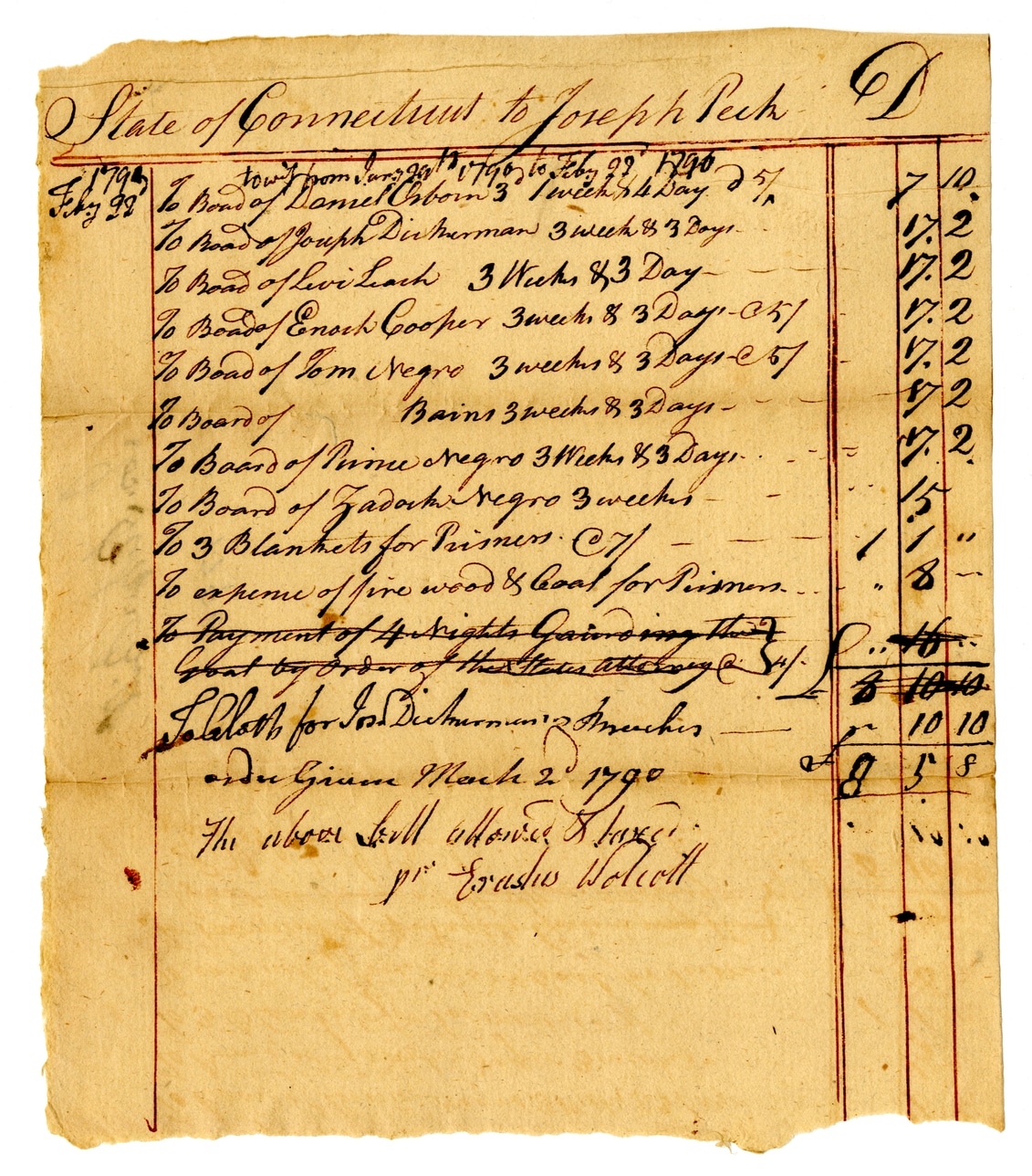 @file_rg003_nhsc_baaI_ps_costs_negroprincetomzadock_005_jpg -> contains -> @bill_1790_02_28:documentState of Connecticut to Joseph Peck Feb 28 To Board of Samuel Osborn 3 weeks & 4 days @ 5/7 7 10 To Board of Joseph Dickinson 3 weeks & 3 days 17 2 To Board of Levi Leach 3 Weeks & 3 Day 17 2 To Board of Enock Cooper 3 weeks & 3 Days @ 5/7 17 2 To Board of Tom Negro 3 weeks & 3 Days @ 5/7 17 2 To Board of Bains 3 weeks & 3 days 17 2 To Board of Prine Negro 3 Weeks & 3 Days 17 2 To Board of Zadock Negro 3 weeks 15 To 3 Blankets for Prisoners @ 7/1 1 1 " To expense of fire wood & Coal for Prisoners " 8 - To Payment of 4 Nights & 1 Morning on the Boat by order of the States Attorney @ $4/ 16 To Cloths for Jos Dickinson's Friends 10 10 order given March 2 1790 The above bill allowed & signed pr: Erastus Wolcott