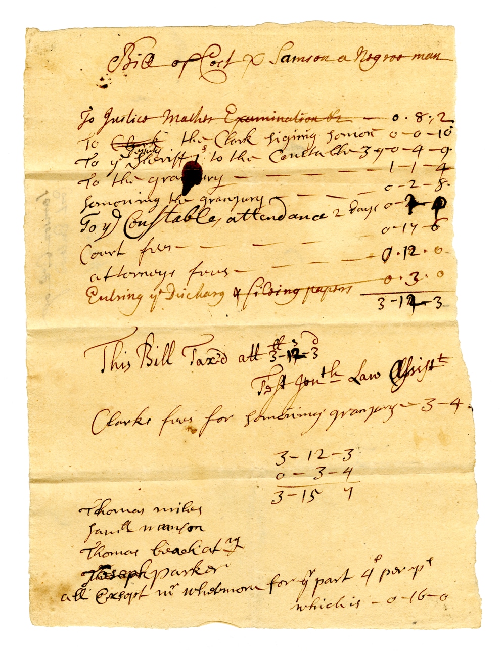 @misc_note:concept {description: "Unclear additional note on the bill"}Bill of Capt. Samson a Negro man To Justice-Master Examination &c. 0.8.2. To Clerk the Clark signing warrant 0-0-10 To y' Sheriff to the Constable 3-9-0-4-9 To the grand jury 1-1-4 Summoning the grand jury 0-2-8 To y' Constable, attendance 2 days 0-2-9 Court fees 0-14-6 Attorneys fees 0.12.0 Entering of discharge & filing papers 0.3.0 3-12-3 This Bill Taxed att 3-12-3 Tax'd by the Law Officer Clarks fees for summoning grand jury 3-4. Thomas miles 3-12-3 Janet manson 0-3-4 Thomas Beach at 7 3-15-7 Joseph parker all except me what's more for my part 4 per pr which is -0-16-0