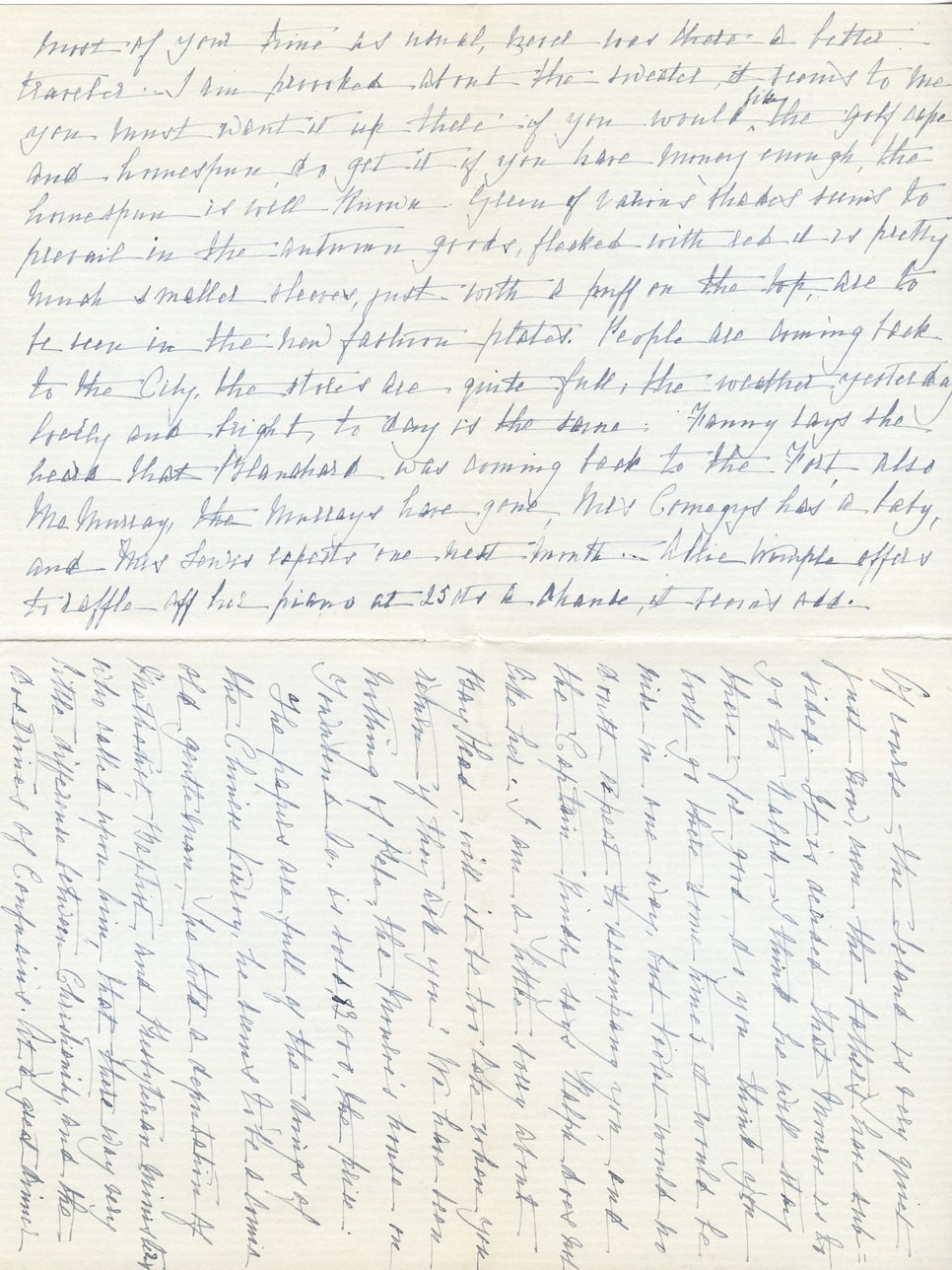 Most of your time as usual, good weather & better travel. I am pleased about the tickets; it seems to me you must want it up there if you would like the gold life and homespun. Do get it if you have money enough, the homespun is well known. Green of Cahins' the best seems to prevail in the autumn goods, flecked with red. It is pretty much smelled & hearse, just with a puff on the top, are to be seen in the new fashion plates. People are coming back to the City, the stores are quite full; the weather yesterday lovely and bright, today is the same. Hanny says she heard that Plankard was coming back to the Fort also. Mrs Murray, the Malleys have gone, Miss Conaght has a baby, and Mrs Lewis expects the next month. Alice Temple offered to raffle off her piano at 25th & Rhade, it doesn't add. Of course, the Island is very quiet now, men, the factory have kind- faced them, men the factory have kind- faced them. It is needed that persons to be glad. I think he will. May I go to Ralph? I think you will. I'm thinking you will go before home; it would be nice in one way, but John would be a little ahead by himself upon him, and the Captain kindly says Ralph should send him for. I am a little sorry about Billy too. If you will you, I have been told of them with you. We have been nothing of Pete, the Murphy's house - no nothing of Pete, the Murphy's house - no nothing of Pete, the Murphy's house - no I received Dr. by Add $2.00, the price. The houses are full of the things of the Chinese factory, the houses to be a man's old gentleman. He took a department of mathematics, and physiognomist, who called upon him, that there was very little difference between Christianity and atheism. A great animal