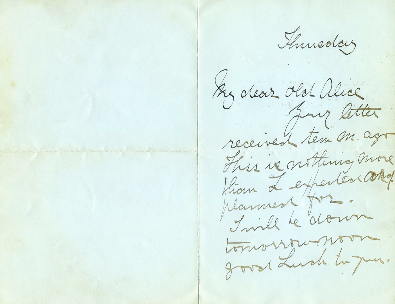 @letter_aug_29_1896_2 -> mentions -> @thompkinsvilleThursday My dear old Alice, Your letter received ten M. ago. This is nothing more than I expected and planned for. I will be down tomorrow noon. Good luck to you.