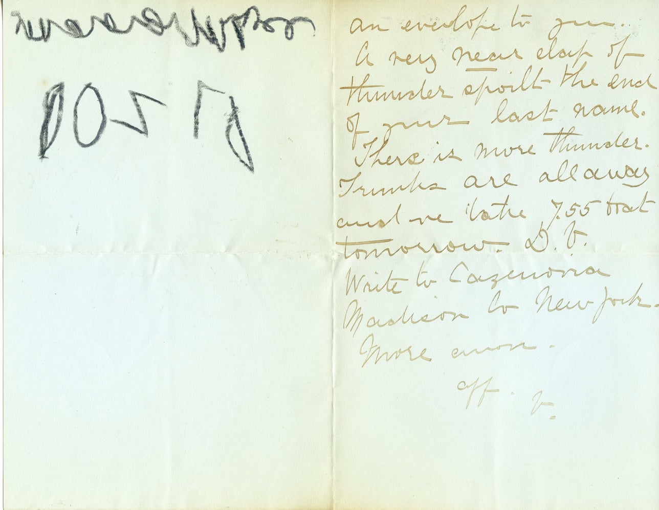 an envelope to you. A very near clap of thunder spoilt the end of your last name. There is more thunder. Trunks are all away and we take 7:55 that tomorrow. D.T. Write to Cazenovia Madison or New York. More anon. off. v.