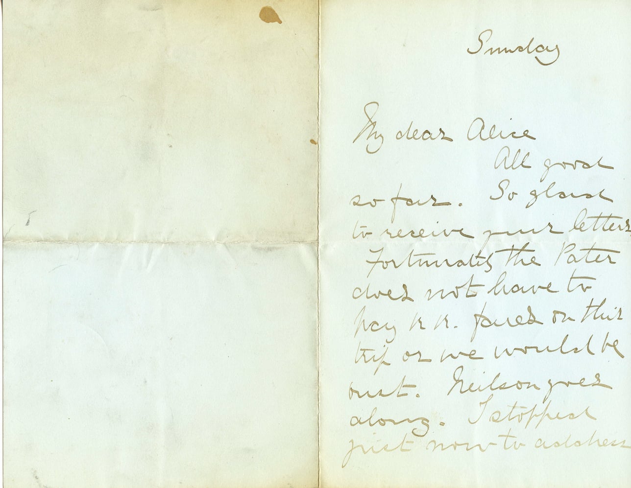 Sunday My dear Alice, All goes so far. So glad to receive your letters. Fortunately the Pater does not have to pay R.R. fare on this trip or we would be out. Wilson goes along. I stopped just now to ask her
