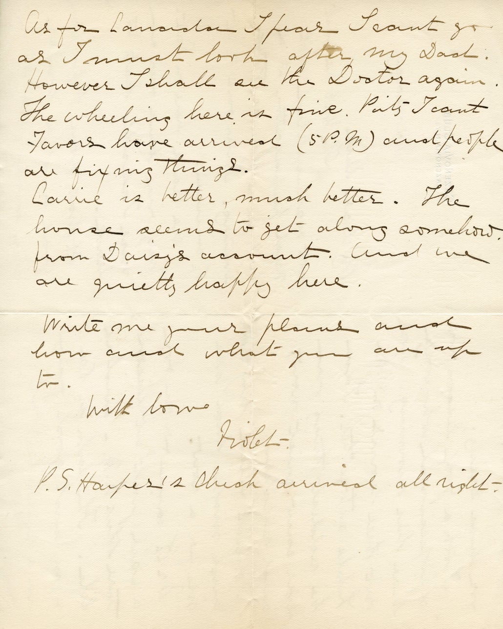 As for Lancaster I fear I can't go as I must look after my Dad. However I shall see the Doctor again. The wheeling here is fine. Pits I can't favor have arrived (5 P.M) and people are fixing things. Larrie is better, much better. The horse seems to get along somehow from Daisy's account. And we are quietly happy here. Write me your plans and how and what you are up to. With love, Violet- P.S. Harper's chest arrived all right.