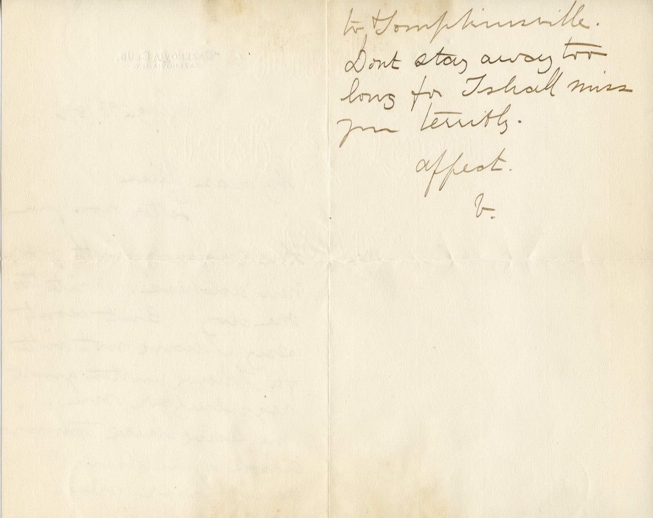 To Thompkinsville. Don't stay away too long for I shall miss you terribly. Affeet. V.