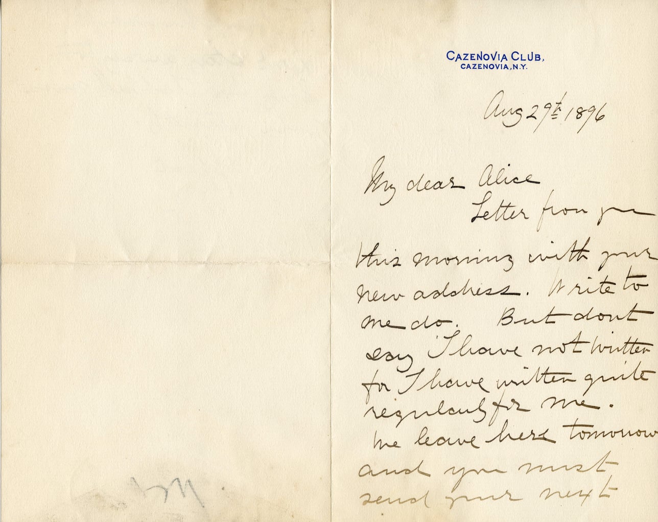 CAZENOVIA CLUB, CAZENOVIA, N.Y. Aug 29th, 1896 My dear Alice, Letter from you this morning with your new address. Write to me do. But don't say I have not written for I have written quite regularly for me. We leave here tomorrow and you must send your next.