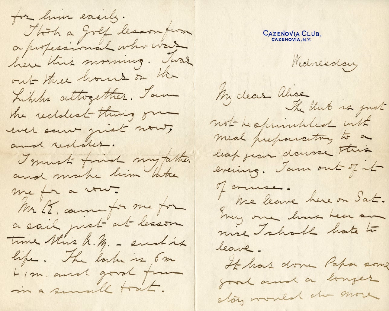for him easily. I took a golf lesson from a professional who was here this morning. I was out three hours on the links altogether. I am the reddest thing you ever saw just now, and redoler. I must find my father and make him take me for a row. Mr. K. came for me for a sail just at lesson time this A.M.—such is life. The lake is 6 m l.m. and good fun in a small boat. CAZENOVIA CLUB, CAZENOVIA, N.Y. Wednesday My dear Alice, The Unit is just not be sprinkled with meal preparatory to a leaf your douse this evening. I am out of it of course. We leave here on Sat. Every one has been so nice I shall hate to leave. It has done Papa some good and a longer stay would do more
