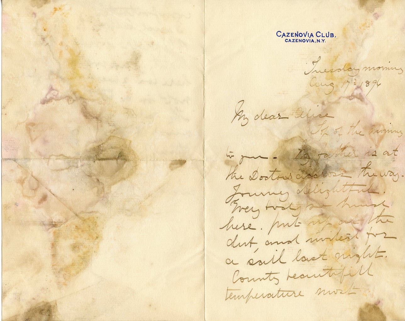 CAZENOVIA CLUB, CAZENOVIA, N.Y. Tuesday morning Aug 17th 1894 My dear Alice, Top of the morning to you. My father is at the Doctor's across the way. Journey delightful. Every body so kind here. Put up on the boat and invited for a sail last night. Country beautiful temperature most