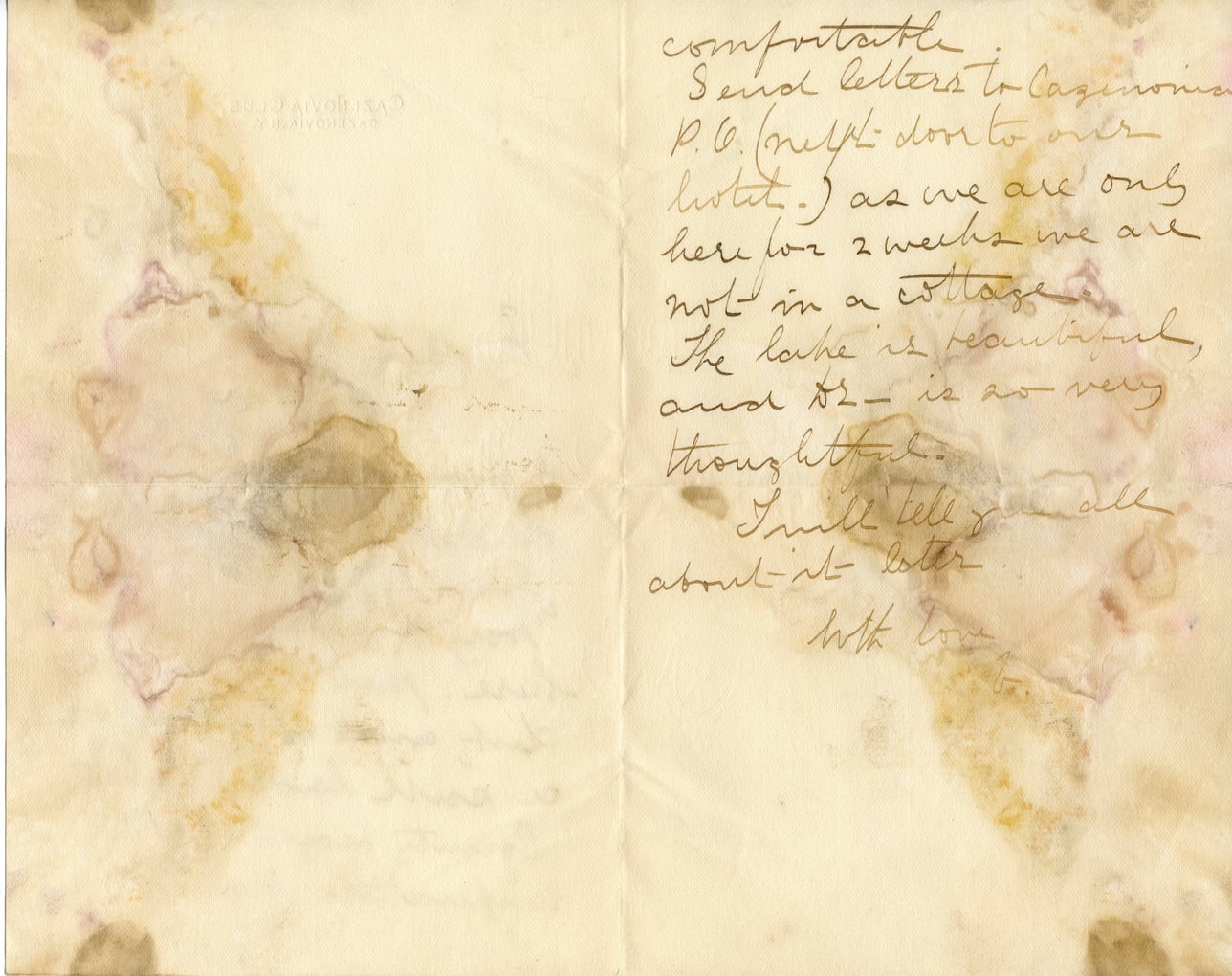 comfortable. I send letters to Cazenovia P.O. (next door to our hotel.) as we are only here for 2 weeks we are not in a cottage. The lake is beautiful, and DZ— is so very thoughtful. I will tell you all about it later. With love, F.