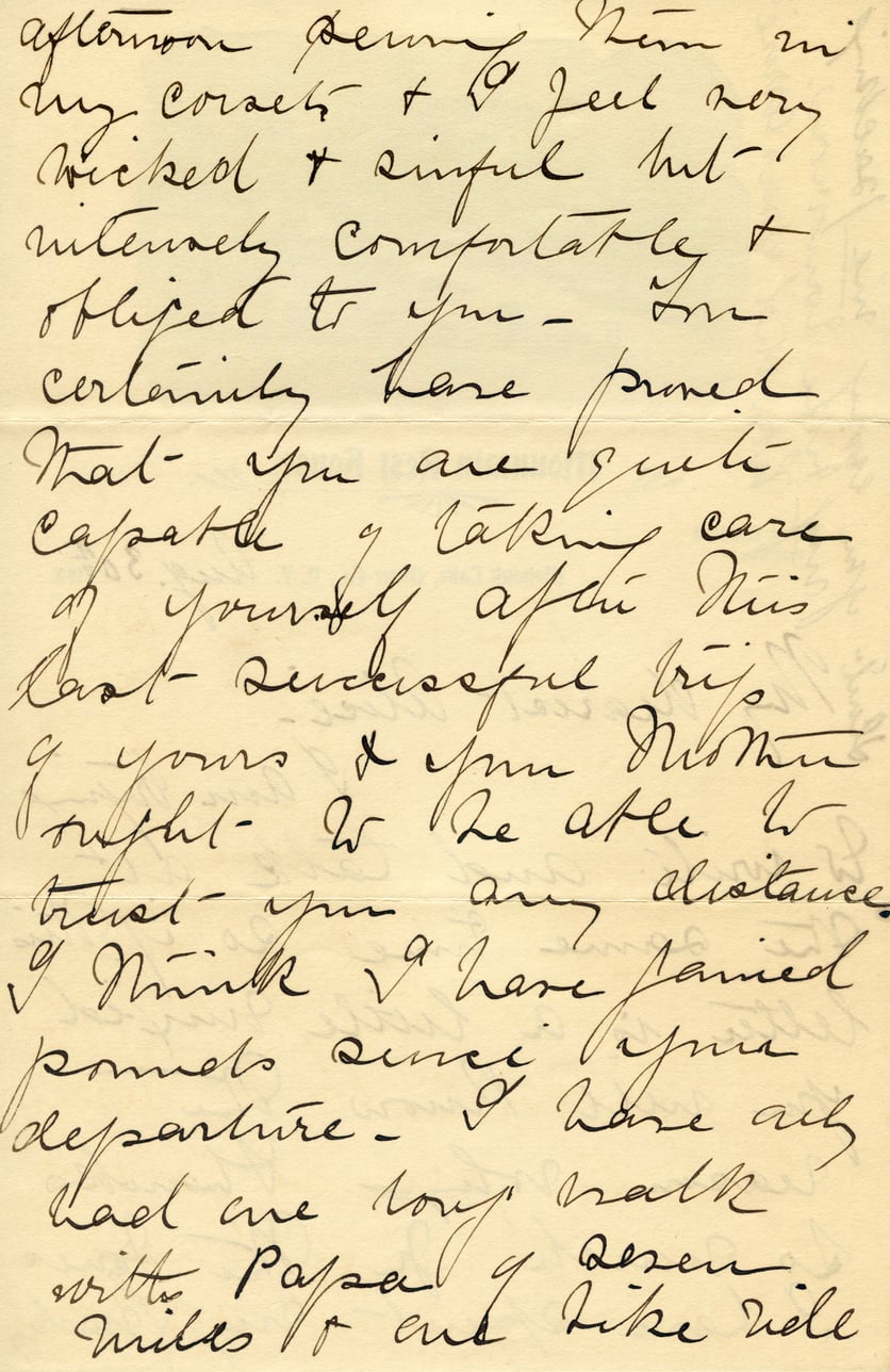 afternoon sitting in my coach & I feel very wicked & sinful but intensely comfortable & obliged to you - I'm certainly here proved that you are quite capable of taking care of yourself after this last successful trip of yours & your mother ought to be able to trust you any distance. I think I have gained pounds since your departure. I have only had one long walk with Papa & never miles to eat like vile