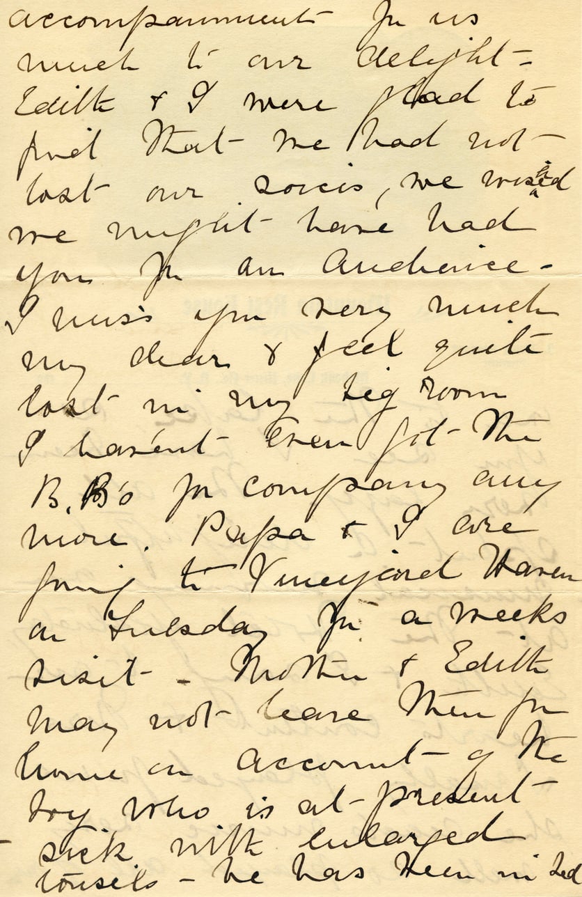 accompaniment in us much to our delight. Edith & I were glad to find that we had not lost our voices, we wished we might have had you in an audience. I miss you very much my dear & feel quite lost in my leg room I haven't even got the B.B.'s in company any more. Papa & I are going to Vineyard Haven on Sunday in a week's visit. Mother & Edith may not leave them for home on account of Kejoy who is at present sick with enlarged tonsils - he has been in bed