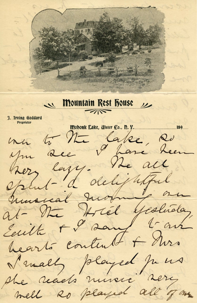 Mountain Rest House J. Irving Goddard Proprietor Mohonk Lake, Ulster Co., N.Y. I've been to the lake. Do you see I have been very lazy. We all spent a delightful musical morning over at the Hotel yesterday. Emily & I sang to our heart's content & Mrs. Vinally played for us. She reads music very well so played all of an